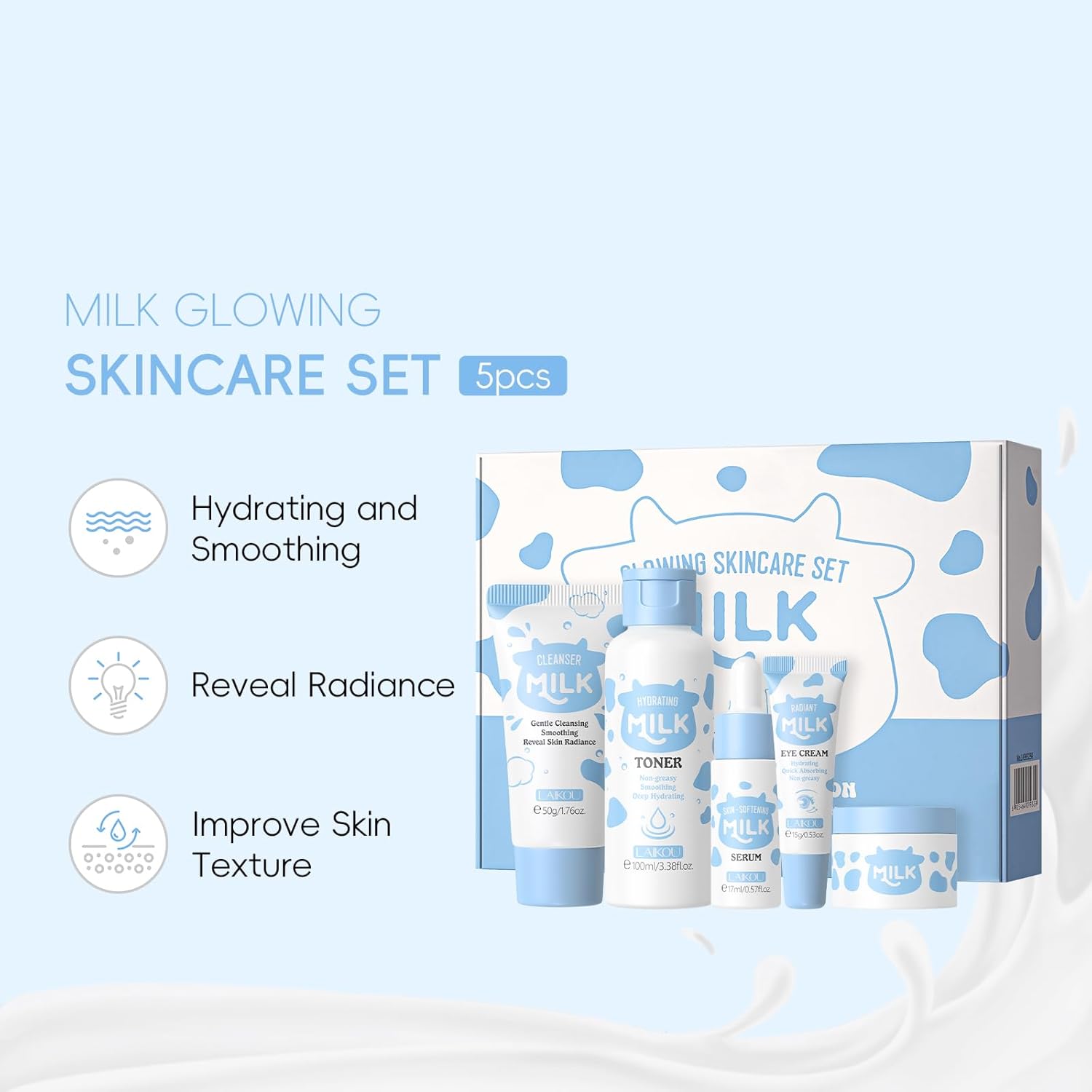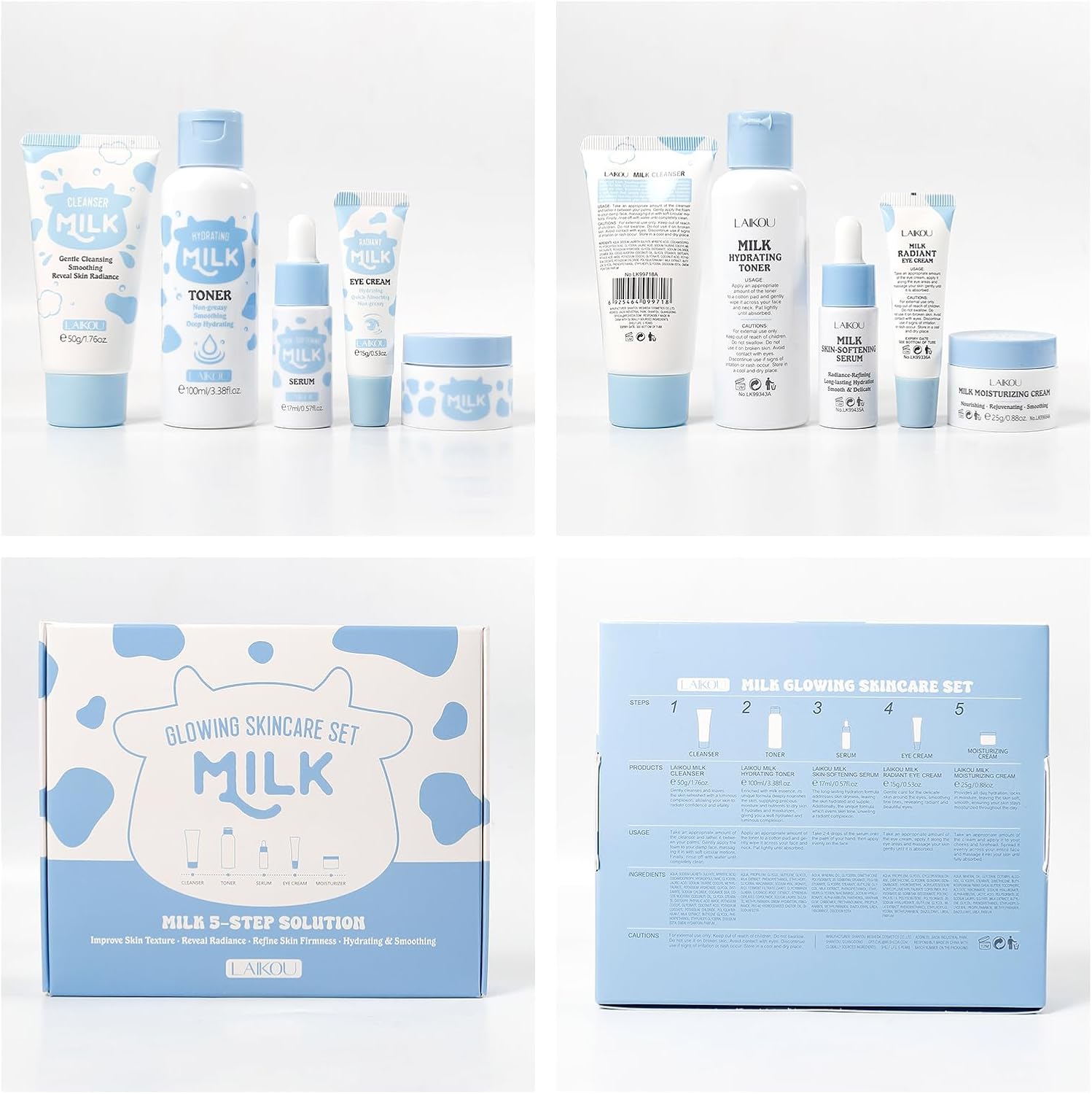 5-delige Huidverzorgingsset met Melk Extracten – Hydraterende Cadeauset voor een Stralende Teint | Ideaal voor Meisjes, Tieners & Vrouwen (Reinigingsgel, Toner, Serum, Oogcrème, Dagcrème)