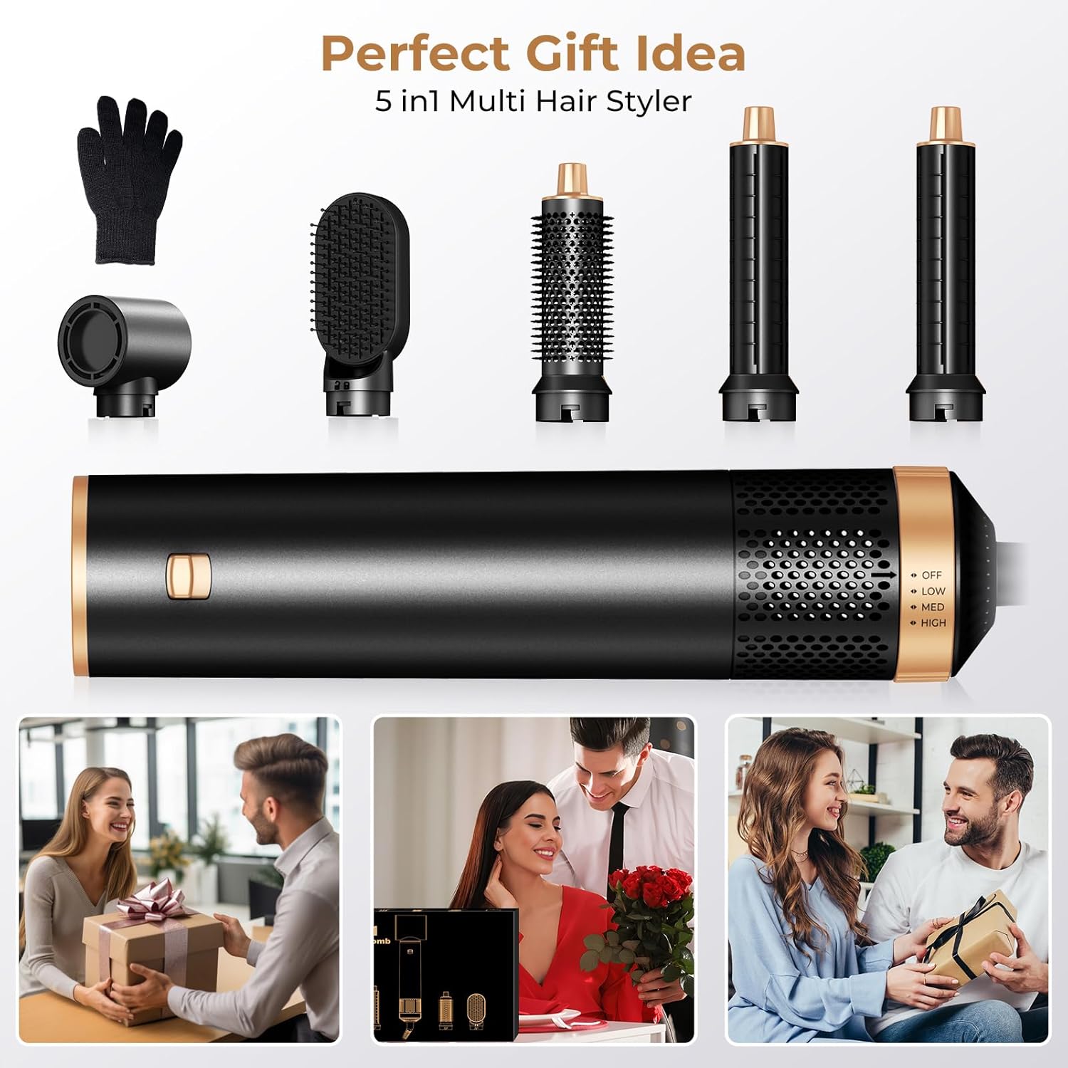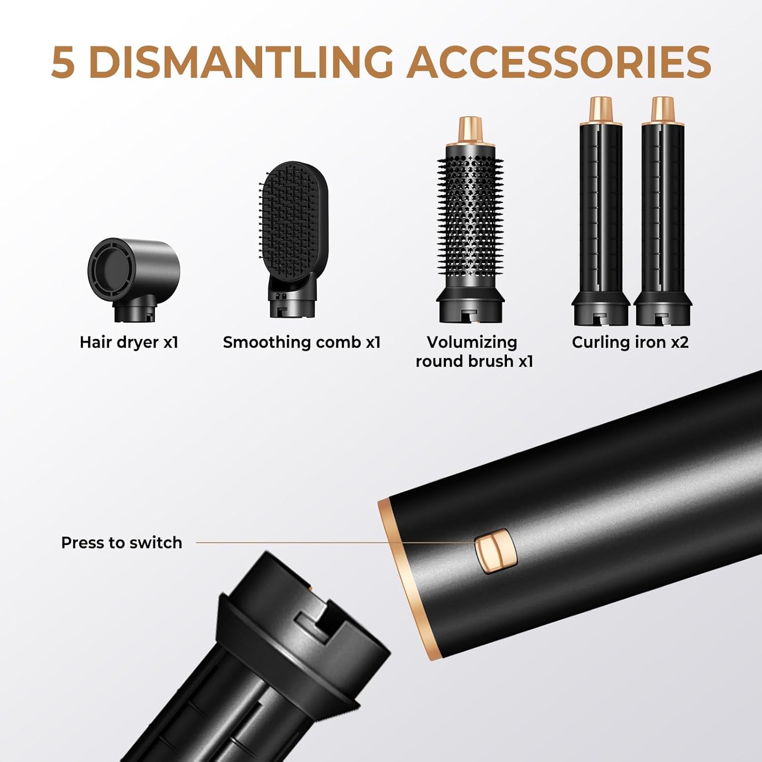 Alles-in-één föhn: geniet van veelzijdige styling met onze 5-in-1 multifunctionele hairstyler airstyler stylingset voor steil, golvend, krullend en kroeshaar, die een föhn, krultang, föhnborstel en stijltang bevat om moeiteloos aan al je stylingbehoeften te voldoen. Voor salon-kwaliteit resultaten thuis. Wees de meest stralende koningin.