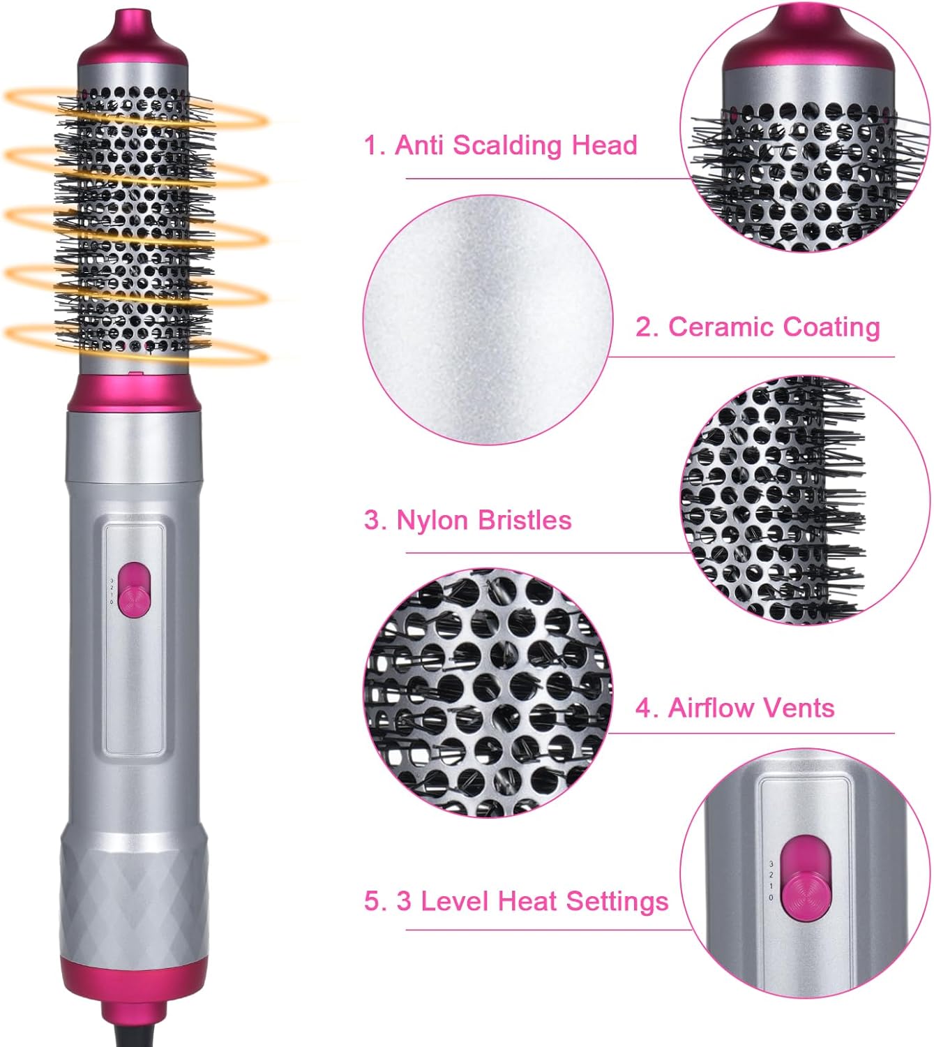 5-in-1 warme luchtborstelset, airstyler set, stylingborstels met haardroger, ronde borstelföhn, airflow krultang, automatisch, stijltang om te drogen, volumiseren, glad maken, steil haar (roze)