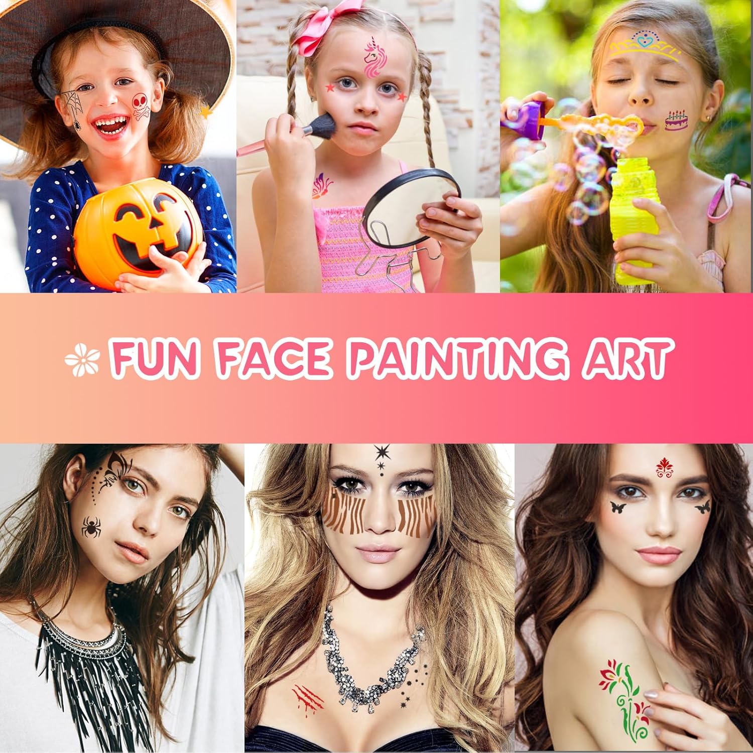 Verschillende stijlen: Deze sjablonen voor het schminken zijn er in 50 verschillende stijlen, zoals dierlijke textuur, bloem, vlinder, schorpioen en meer, voldoende hoeveelheid en stijlen om uit te kiezen.
