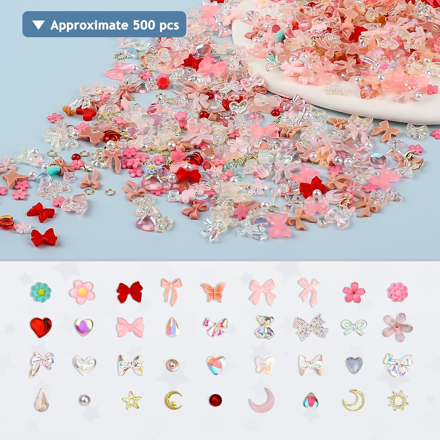 Gemengde nagelaccessoires: deze nailart-accessoireset bevat in totaal 500 stuks 3D-nailart-accessoires en strass-steentjes in verschillende kleuren en vormen, ontworpen in harten, rozen, vlinders, beren, strikken, banden, kralen, sterren, maan, enz., prachtige uitstraling, presenteert een driedimensionaal effect, voegt charme toe aan je nagelkunst.