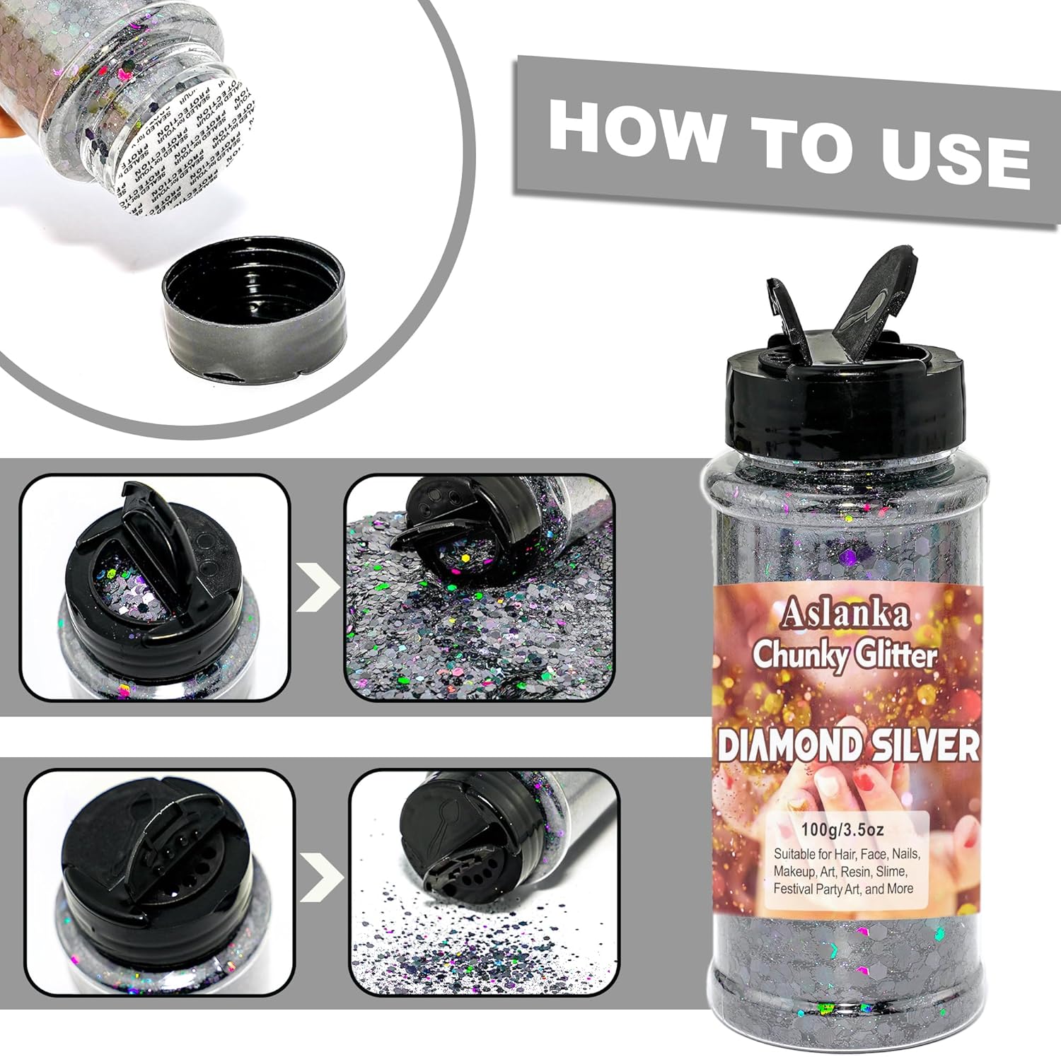 Waarom zou je voor de dikke glitter van Aslanka kiezen? 500 g grote capaciteit 100% veilig en niet giftig Heeft een unieke glinsterende glitter dikke glitter en fijne glitter