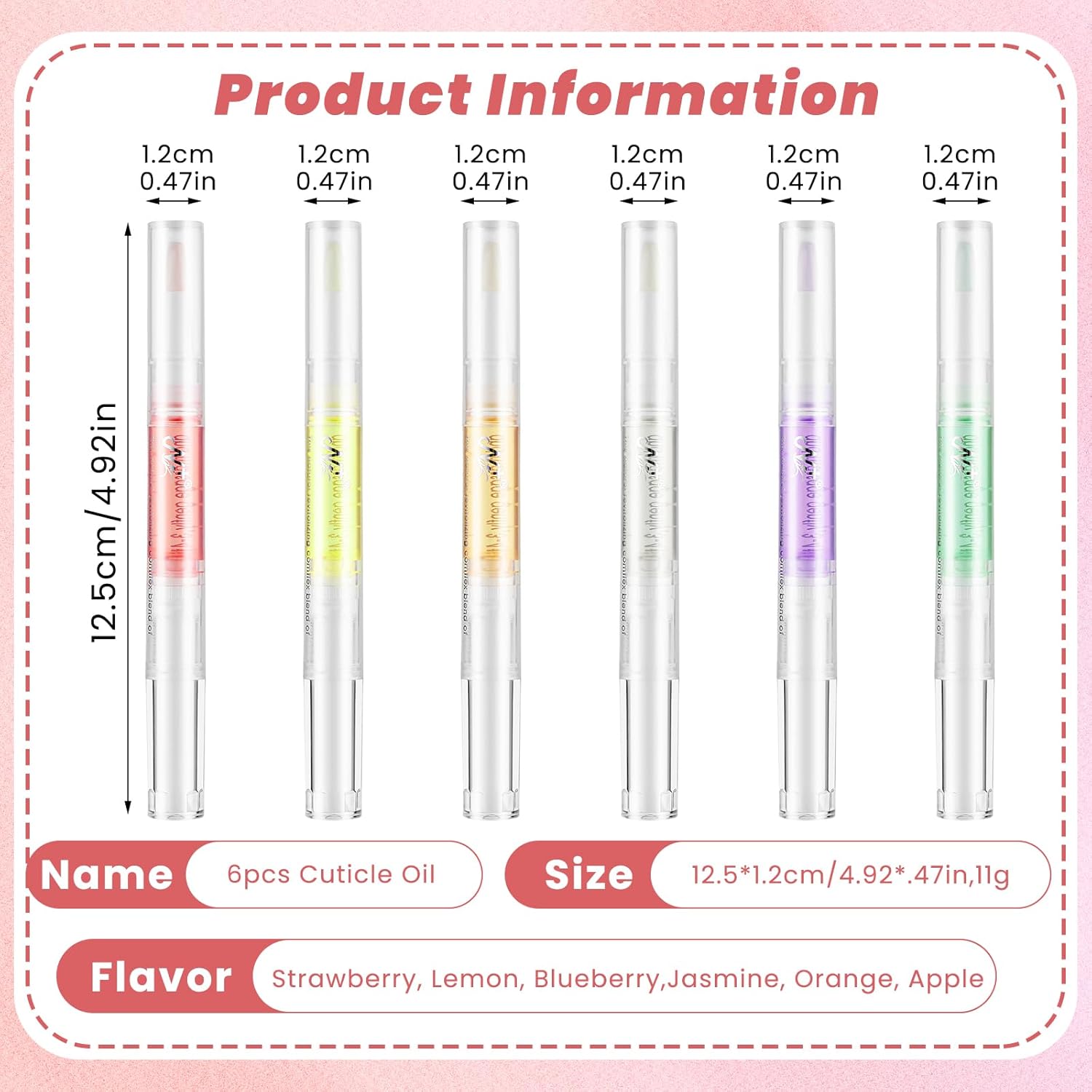 【6 stuks nagelriemoliesticks met verschillende smaken】Onze nagelriemolieset bevat 6 verschillende smaken om uit te kiezen: jasmijn, citroen, sinaasappel, aardbei, groene appel en bosbes. Het kan worden gebruikt om op het nageloppervlak aan te brengen of om de huid rond de nagels te masseren om ze glans te geven en effectief te hydrateren. De nagelriemolie kan ook worden gebruikt voor vinger- of teennagels en verheldert de teint.