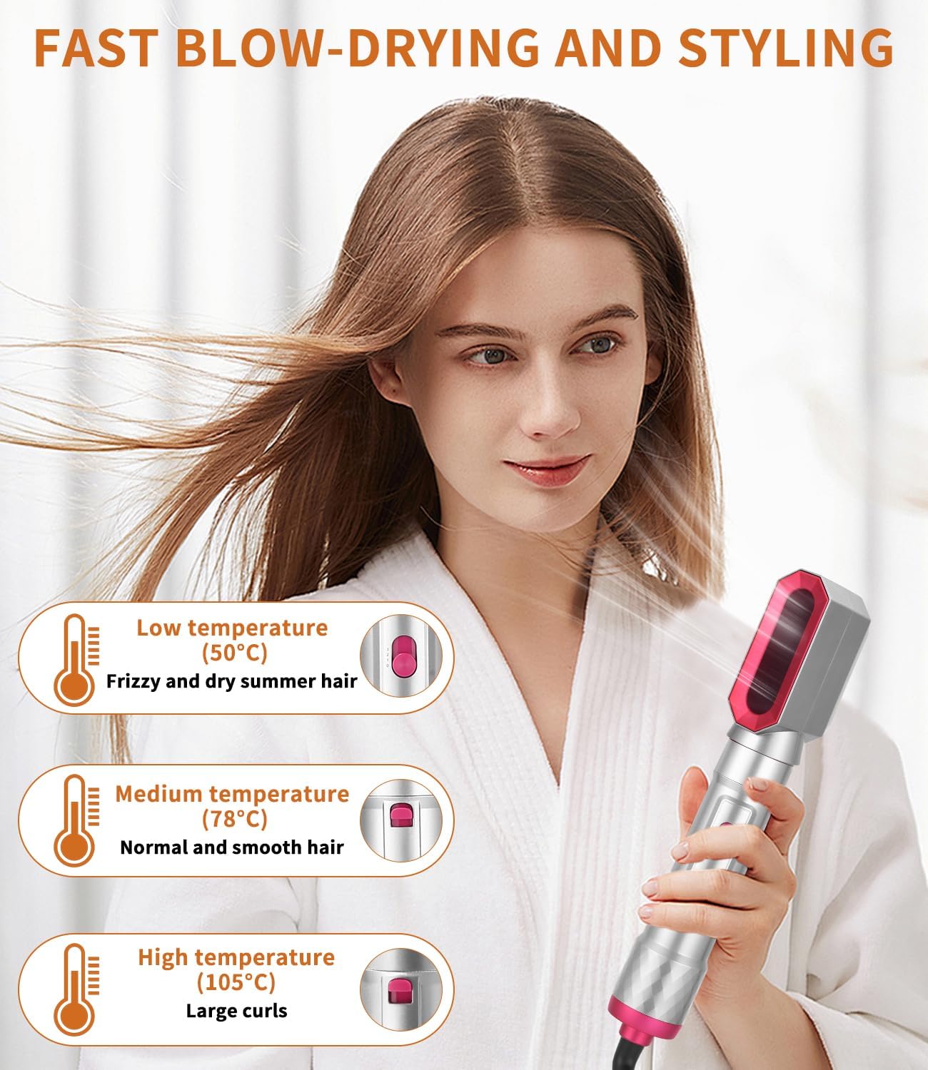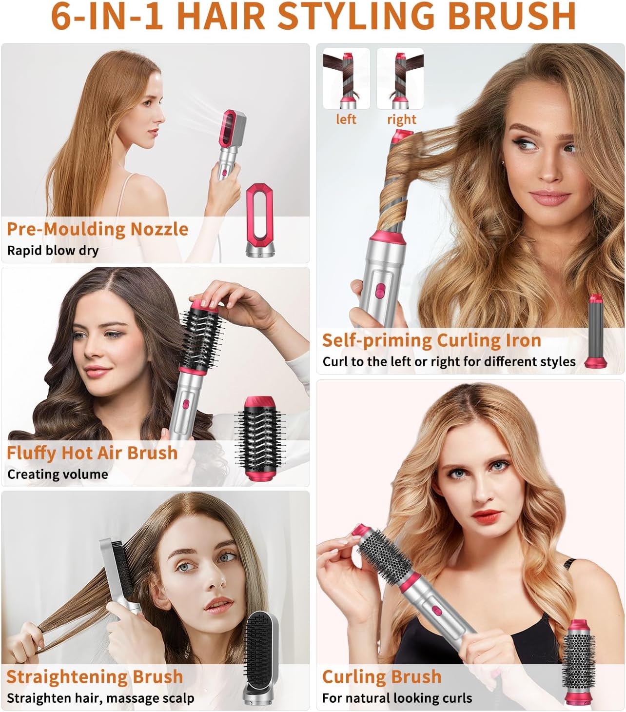 6-in-1 haarstijl: Hot Air Styling Brush is een set multifunctionele stylingborstels, de set bevat 1 haardroger, 1 pluizige heteluchtborstel, 1 heteluchtkrultang, 2 all-in-one luchtstylers voor het haar, 1 halve cirkel-stijlborstel, de rijke stylingborstelset is geschikt voor het maken van verschillende kapsels voor verschillende haarlengtes, het is een geweldige stylinghulp voor het maken van verschillende haarlengtes. thuis, bruiloften, zakenreizen. en vakanties, maakt het föhnen, gladmaken, krullen en volume van haar kinderspel