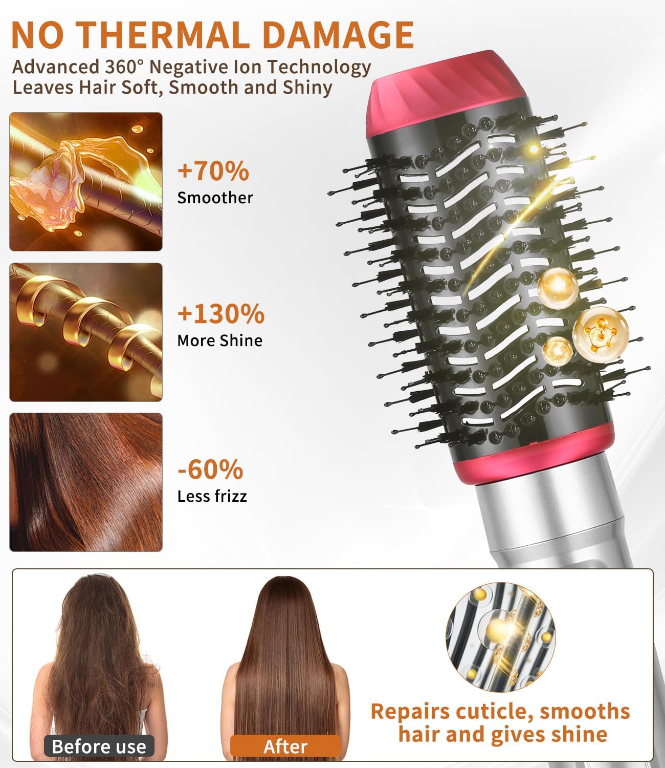 Negatieve ionconditioning haardroger: de 6-in-1 haardroger heeft een ingebouwde krachtige motor die een sterke luchtstroom genereert en een heteluchtborstel met negatieve ionentechnologie die statische elektriciteit tegengaat, het haar hydrateert en verzorgt en het haar bij het drogen extra glans geeft. Verminder statische elektriciteit, zeg kroezen en houd je haar gezond