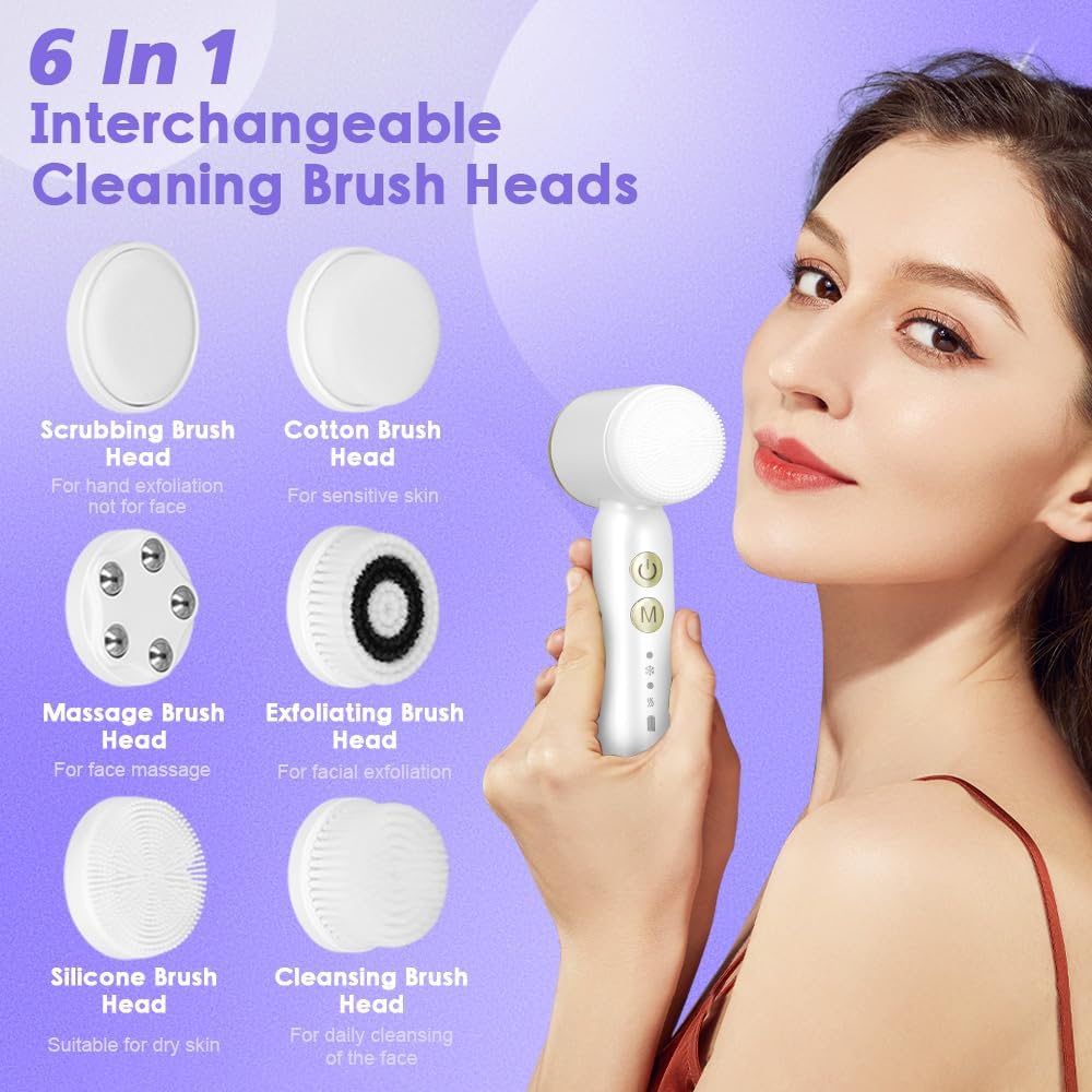 6-in-1 elektrische gezichtsreinigingsborstel, oplaadbaar, reinigt en peelt de huid, dubbele modus, warm en koud, kit met 6 verwisselbare borstelkoppen, IPX7 waterdicht