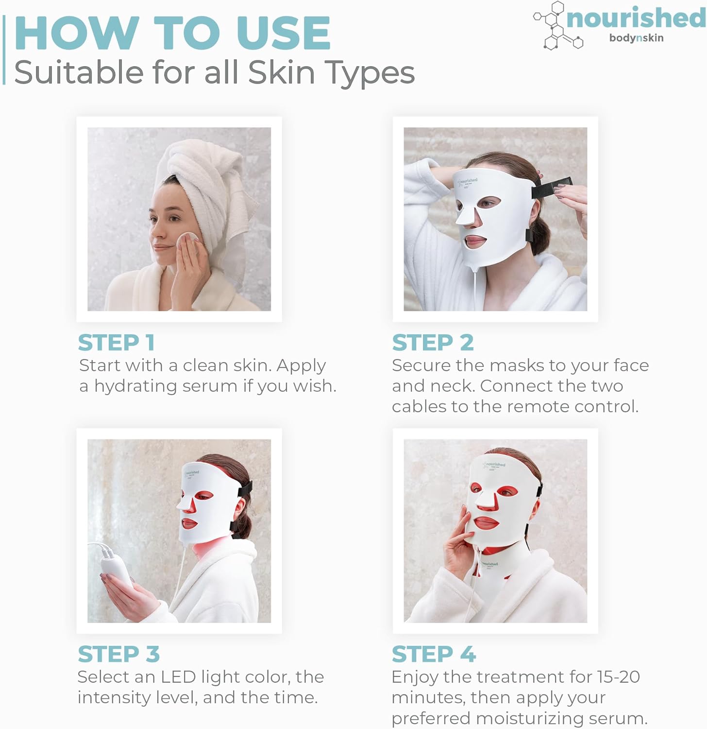 Le système est assez simple à mettre en fonction.Le masque n’appuie pas très fort sur le visage et la sangle élastique est réglable.Les yeux sont libres et on peut regarder la télé pendant le soin.Il faut l’utiliser sur du long terme. Pour la peau quand même le système est efficace, déjà je la trouve d’un meilleur aspect.Toutes les LED fonctionnent.