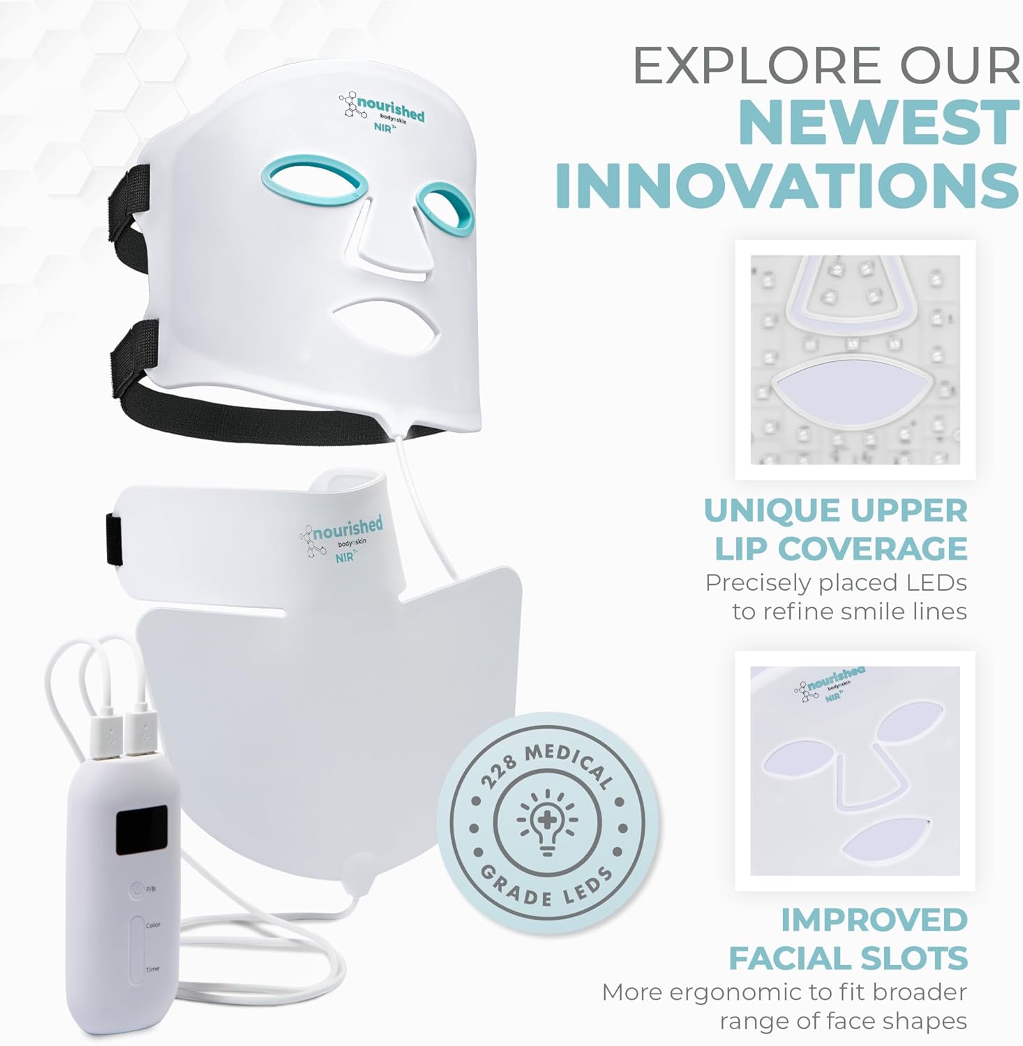 Innovatief Decolleté en Gezichtslichttherapieapparaat: Met 228 LEDs zorgvuldig geplaatst in een basis van siliconen van medische kwaliteit om vaak verwaarloosde gebieden zoals de zone onder de ogen en de bovenlip te richten om lachlijnen te verzachten