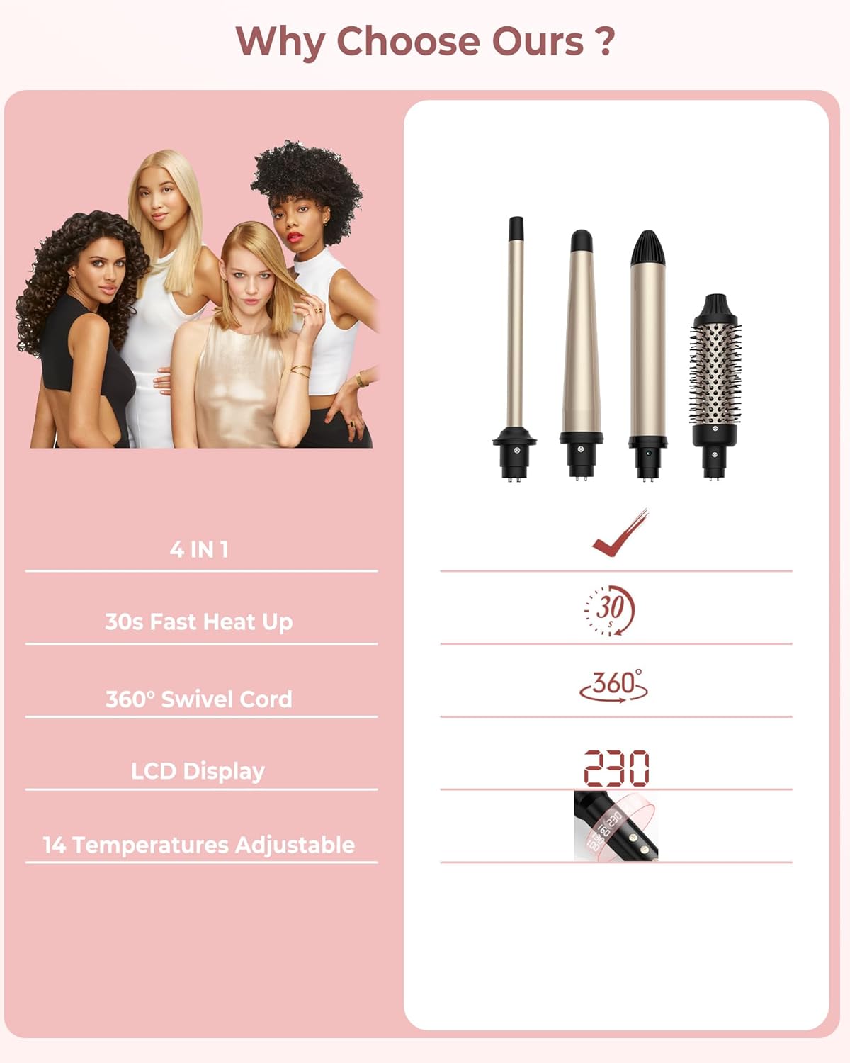 ⭐【Groot LCD-scherm met temperatuurweergave】De temperatuur van de 4-in-1 krultang is instelbaar van 100 °C tot 230 °C. U kunt de juiste temperatuur instellen op basis van uw haartype. lagere temperatuur is geschikt voor zacht en fijn haar; Voor dik en hard haar moet de temperatuur hoger zijn. U hoeft niet veel tijd en geld te verspillen door in de kapperszaak te wachten. Neem elke ochtend 8-10 minuten de tijd om na het opstaan het perfecte kapsel te creëren