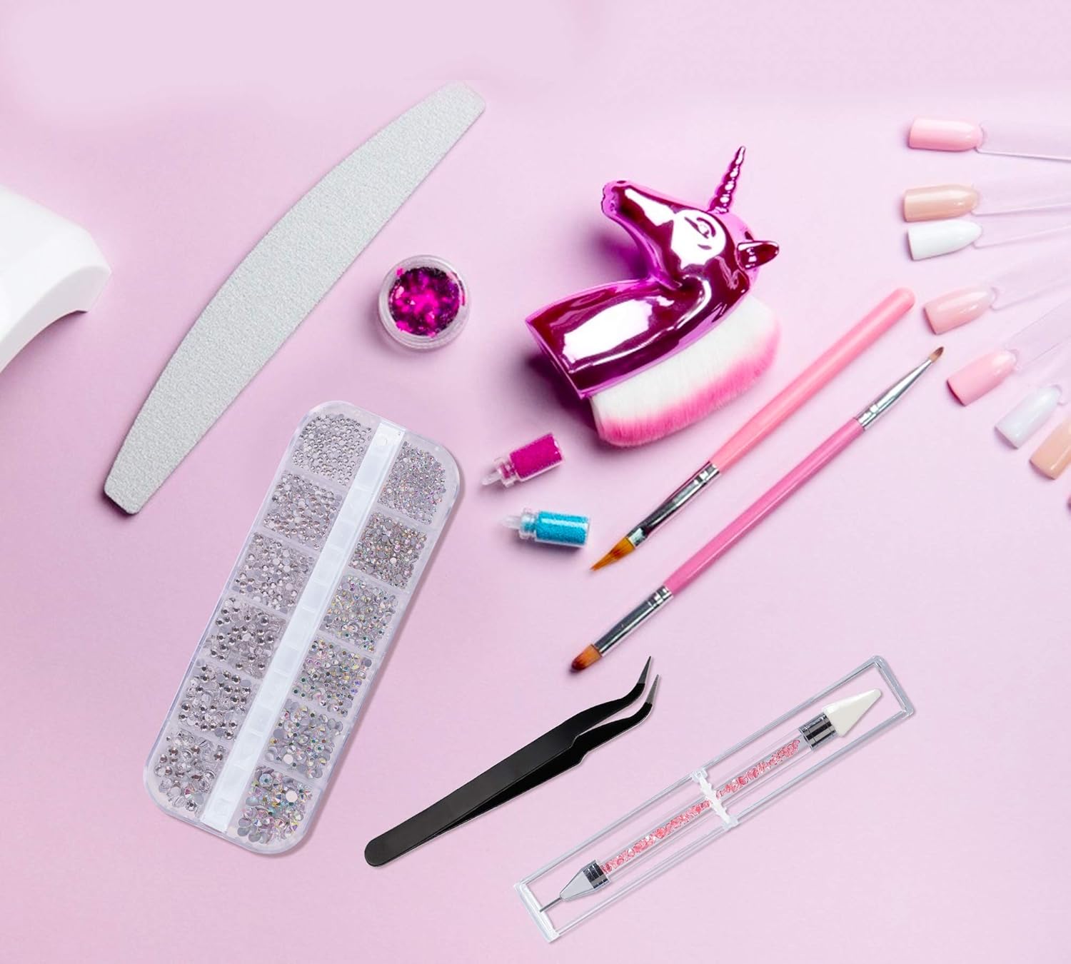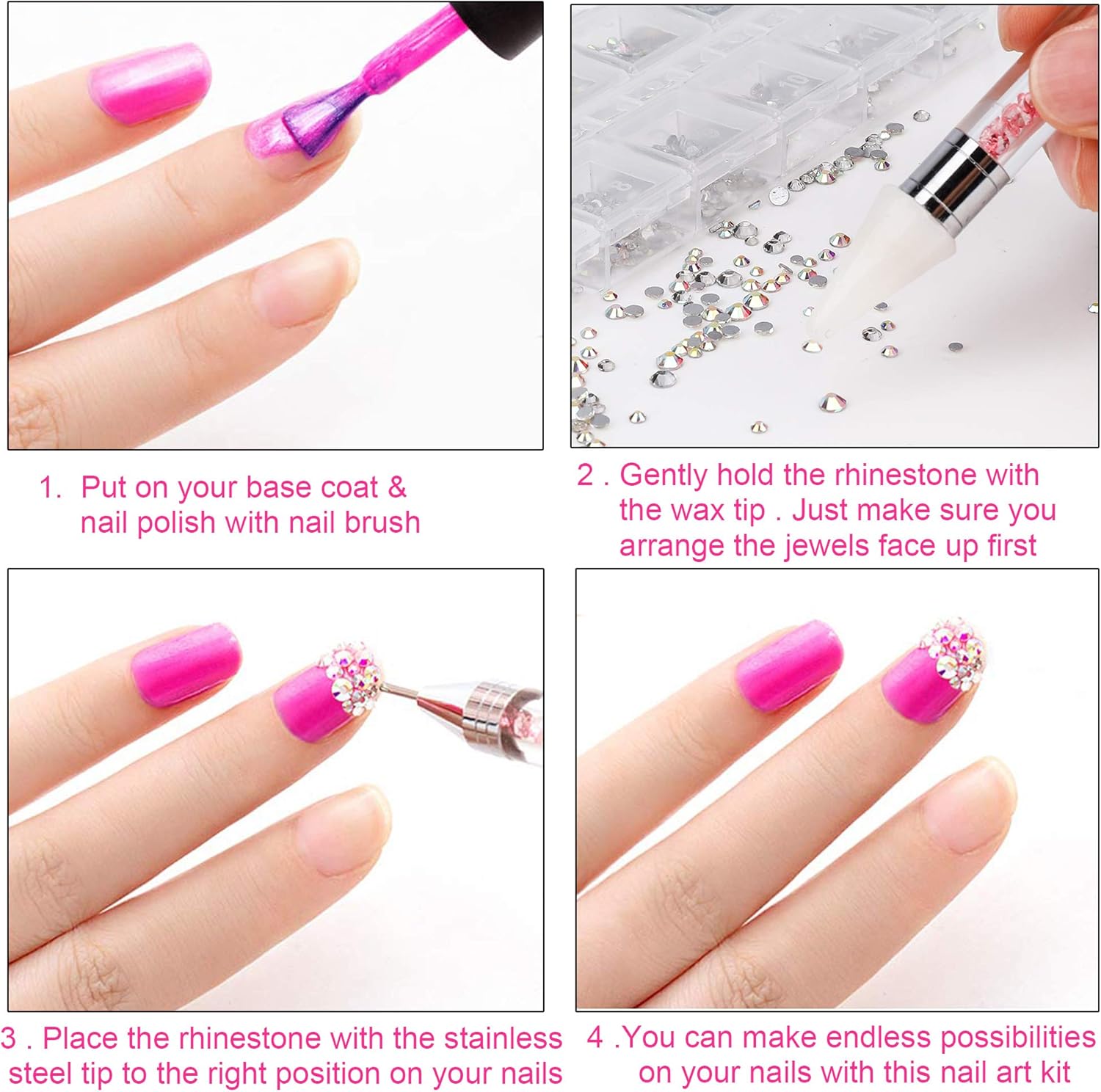 Package Contents: A set of nail art rhinestones contains about 1440 rhinestones, tweezers and a rhinestone picking dot that can create different types of nail art.