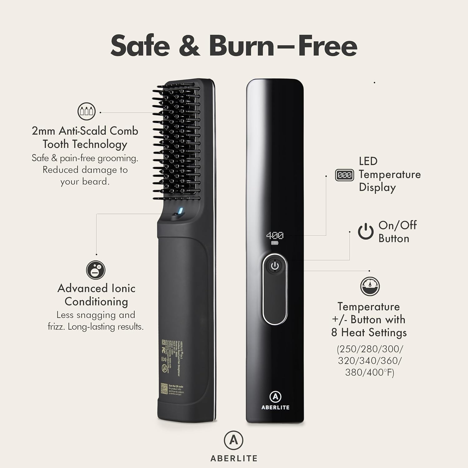 Aberlite Go 2 draadloze stijltang voor baard en haar, pijnloze kamtand, geavanceerde ionenconditioning, draadloze stijltang, verwarmde borstelkam voor