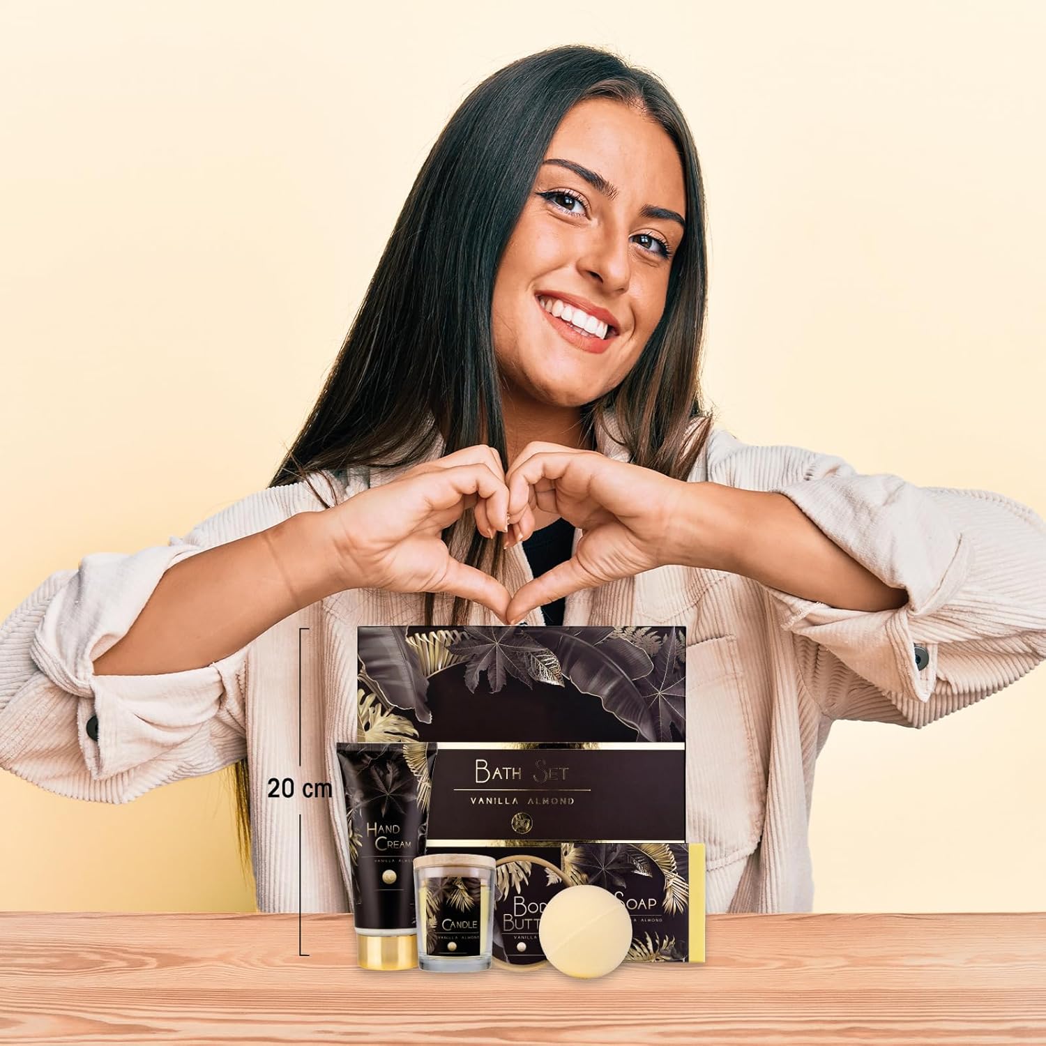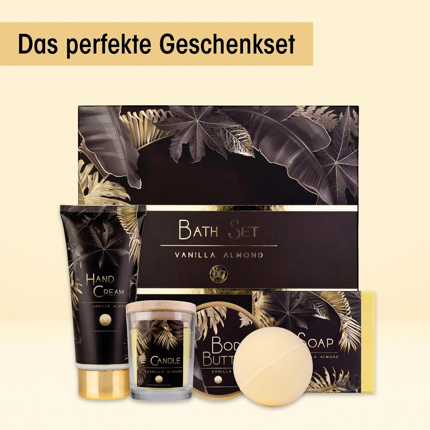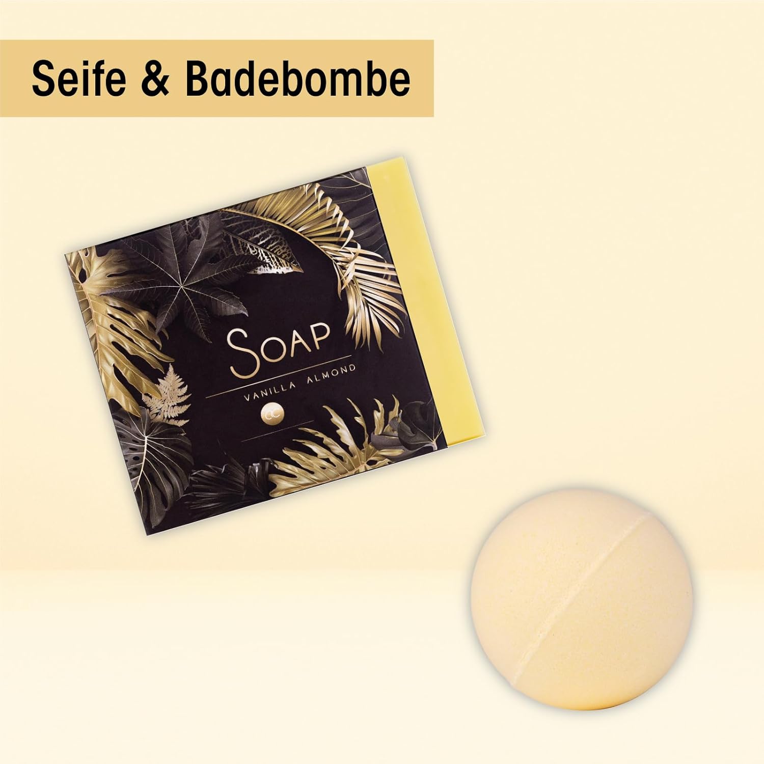 Deze badset is een geweldig cadeau-idee voor alle bad- en wellnessliefhebbers. 100 gram zeep, een bath bomb van 80 gram, 100 ml body butter, 90 ml handcrème en een geurkaars zorgen voor een ontspannen avond! Naast het verzorgende aspect van de badproducten zorgt de geur Vanille Amandel voor een badkamer die prettig ruikt en je een prettig gevoel geeft. De cadeauset is verpakt in een mooi design en heeft de afmetingen 20 x 6 x 20 cm en is daardoor ideaal om cadeau te geven. Verras een geliefde, je beste vriendin, je moeder, je zus, je dochter met deze speciale set – gewoon het perfecte kleine cadeautje voor elke gelegenheid.