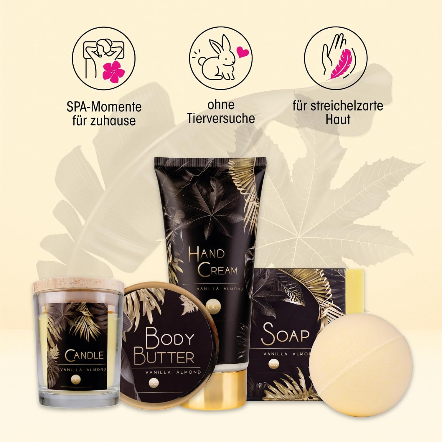Geurende verwenset: de naar Vanilla Almond geurende verzorgingsproducten verwennen de huid, waardoor deze zacht en soepel wordt. De ideale verzorging voor thuis en gegarandeerde ontspannen feel-good momenten