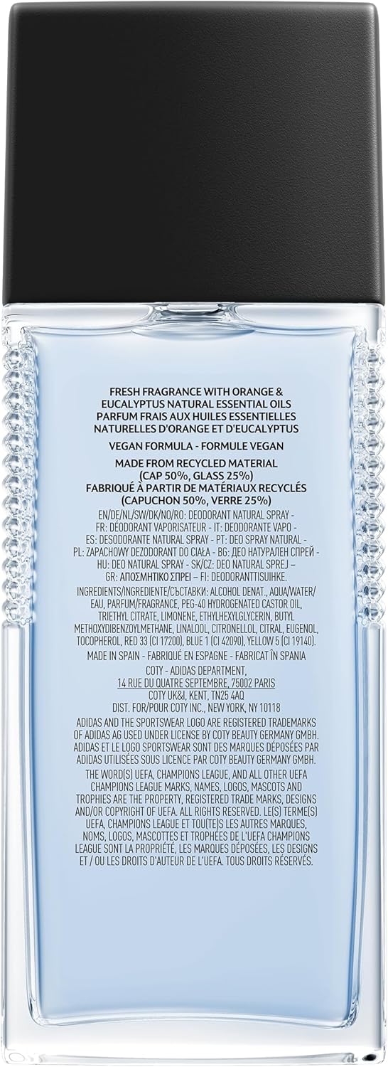 De UEFA Star Edition verfrissende deodorant voor heren van Adidas is een frisse, langdurige geur die tonen van sinaasappel, eucalyptus en patchouli. De veganistische formule van Adidas deodorant bevat natuurlijke etherische oliën van sinaasappel en eucalyptus. De fles is gemaakt van 25% gerecycled glas en de dop is gemaakt van 50% gerecycled plastic.
