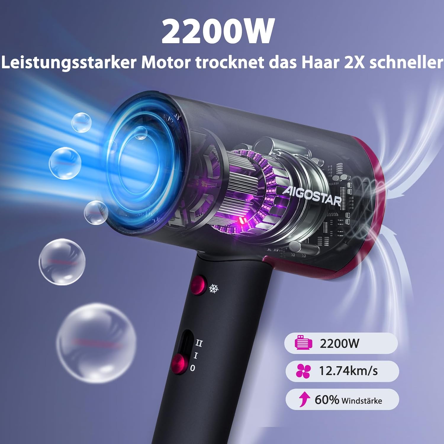 Aigostar Dora Haardroger, 2200 W, ionen-haardroger, 3 temperaturen, 2 snelheden, reisdroger met koude knop, afneembaar achterrooster, voor thuis, reizen, sportschool