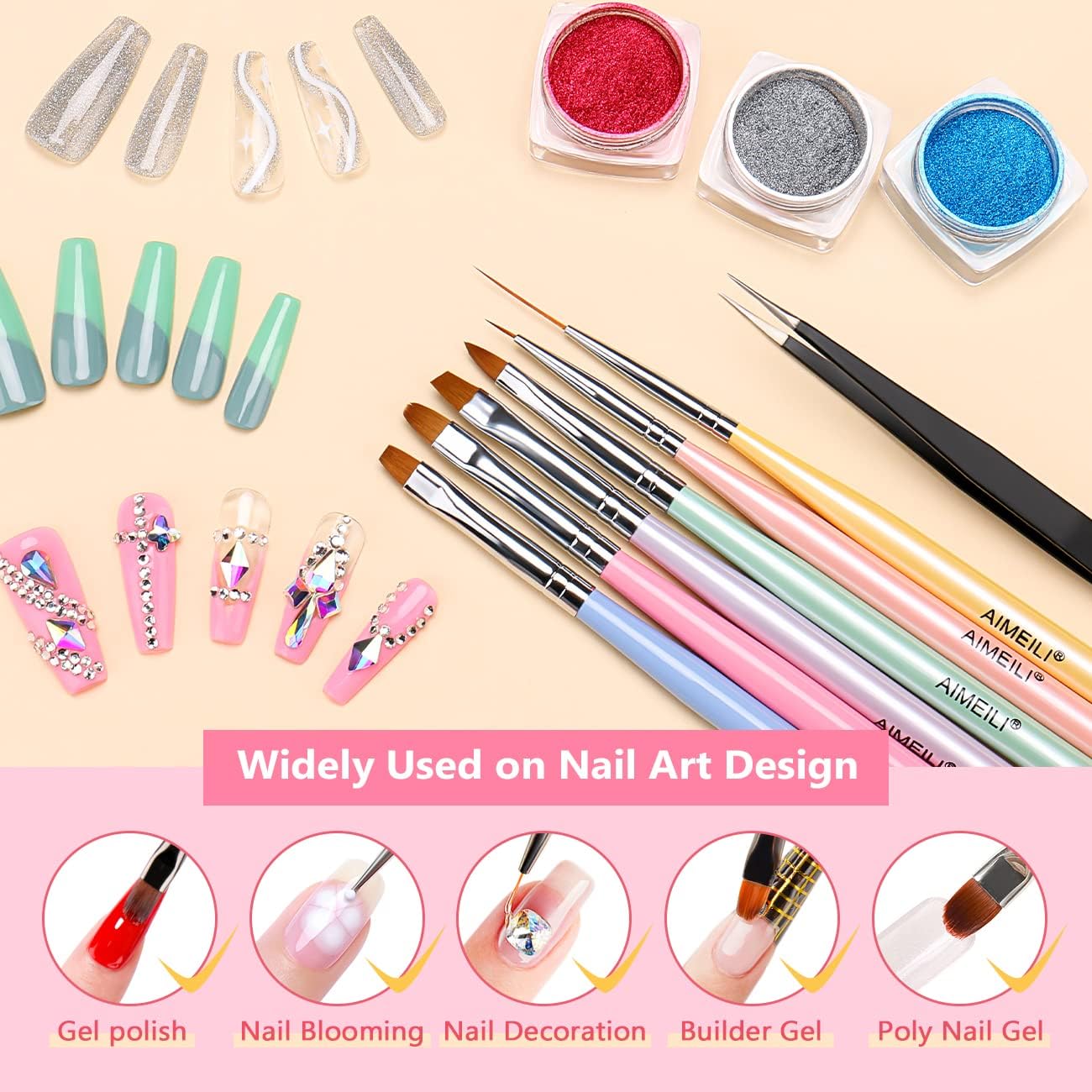 6 verschillende nail art design pennen: nail extension gel brush, builder gel brush, nail carving pen, nail art liner brush en nail dotting pen. Voldoe aan uw verschillende behoeften voor nail art.