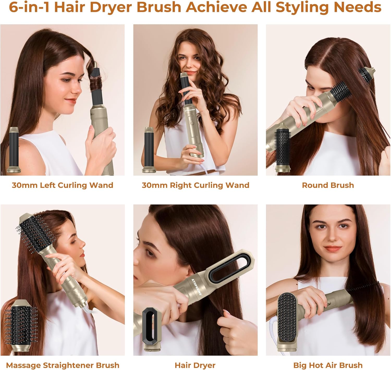 【6-in-1 blaasborstel en haardroger】De 6-in-1 haardroger bevat 1 haardroger, 2 krullende lucht in verschillende richtingen, 1 ronde blaasborstel, 1 stijlborstel, 1 massageborstel. Krullen, gladmaken, volume geven en stylen, ionische verzorging, voldoet aan al je stijlbehoeften, 6-in-1 verwarmingsborstel bespaart tijd en geld.