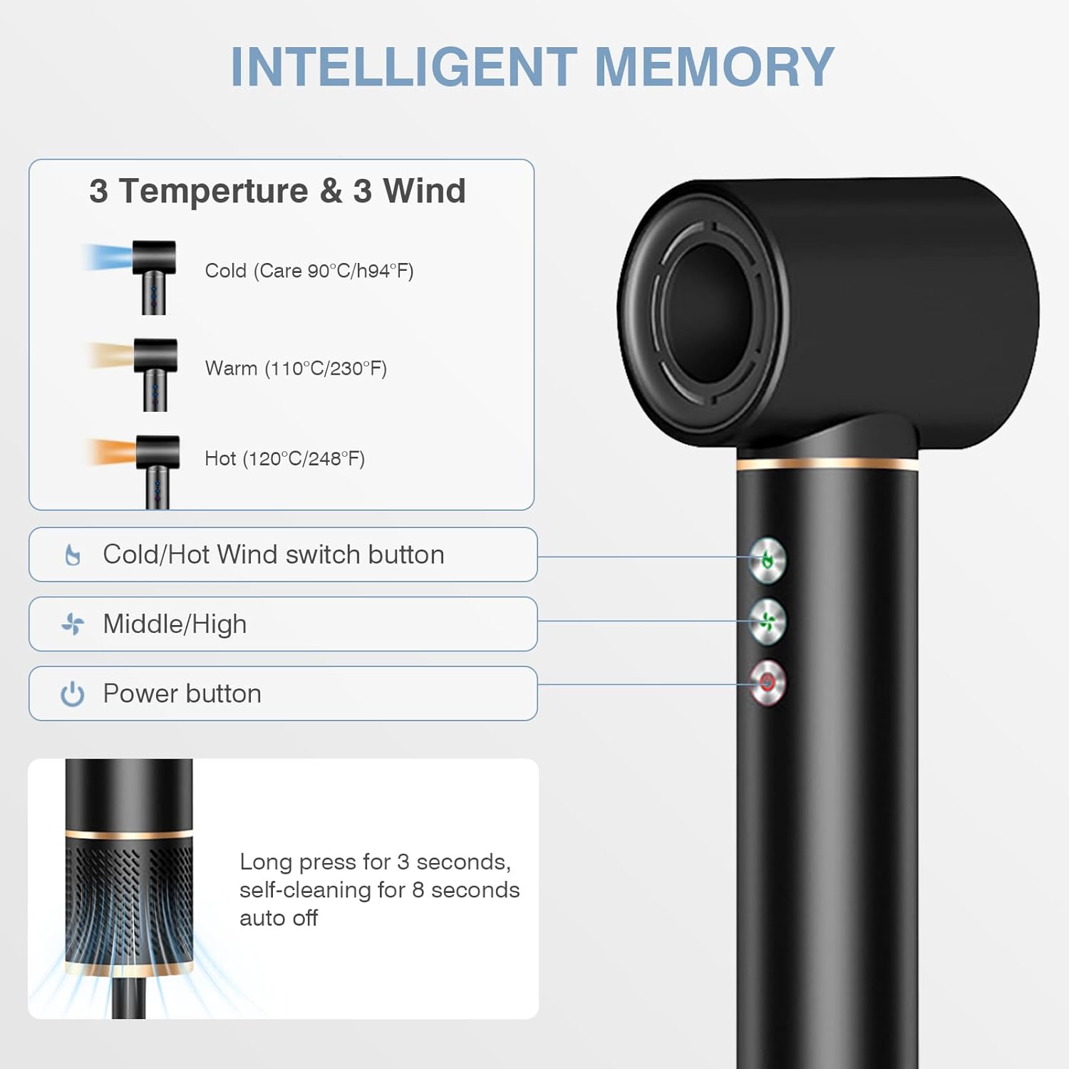 110.000 rpm: de haardroger heeft een vermogen van 1400 watt, een verbeterde snelverwarmingstechnologie en is uitgerust met een krachtige borstelloze hogesnelheidsmotor met 110.000 omw/min, die een windsnelheid van maximaal 20 m/s bereikt. Hij schakelt over naar hoge snelheid en produceert in slechts 1 seconde een sterke luchtstroom, waardoor de föhn supersnel droogt, terwijl de warmte laag wordt gehouden, wat minder krullen garandeert en je haar glad en glanzend houdt.