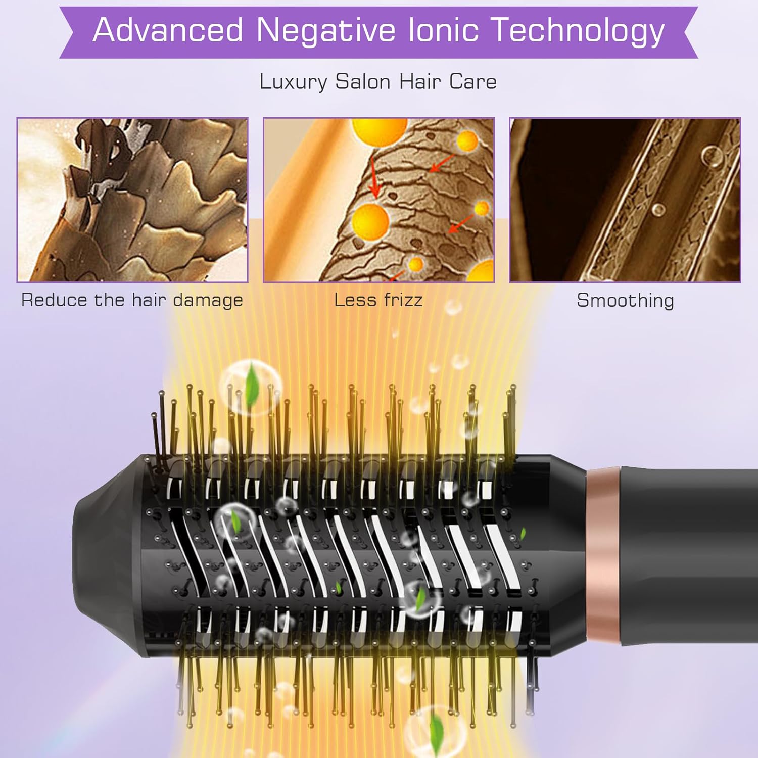 1. 6-in-1 haardrogerstyling-tool: deze 6-in-1 haarstylingsset bevat 1 x haardroger, 1 x heteluchtborstel, 2 x luchtkrultangen, 1 x volumegever, 1 x massage-stijlborstel. Draag bij het vervangen van de afneembare haardroger beschermende handschoenen. om brandwonden te voorkomen (je kunt al in de eerste minuten na het eerste gebruik een lichte geur waarnemen, deze is volledig normaal en verdwijnt snel) 2. 【3 temperatuurinstellingen】 ➤ 1: lage temperatuur 50 °C, hoge windsnelheid, geschikt voor droog/fijn haar, geschikt voor zomergebruik. ➤ 2: gemiddelde temperatuur 80 °C, hoge windsnelheid, geschikt voor halfdroog haar/normaal haar, geschikt voor styling. ➤ 3: hoge temperatuur 105 °C, hoge windsnelheid, geschikt voor nat haar/dik krullend haar, geschikt voor wintergebruik, snel drogen van het haar 3. 【200 miljoen negatieve ionen-haardroger】 Het 6-in-1 haarstrijkijzer beschikt over een ingebouwde generator die negatieve ionen afgeeft om je fijne haar vrij van krullen te houden, vocht vast te houden en je haar een natuurlijke glans te geven. te geven. Bovendien kan de intelligente constante temperatuur de opwarming van je hoofdhuid verminderen en je haar beschermen tegen schade door hitte