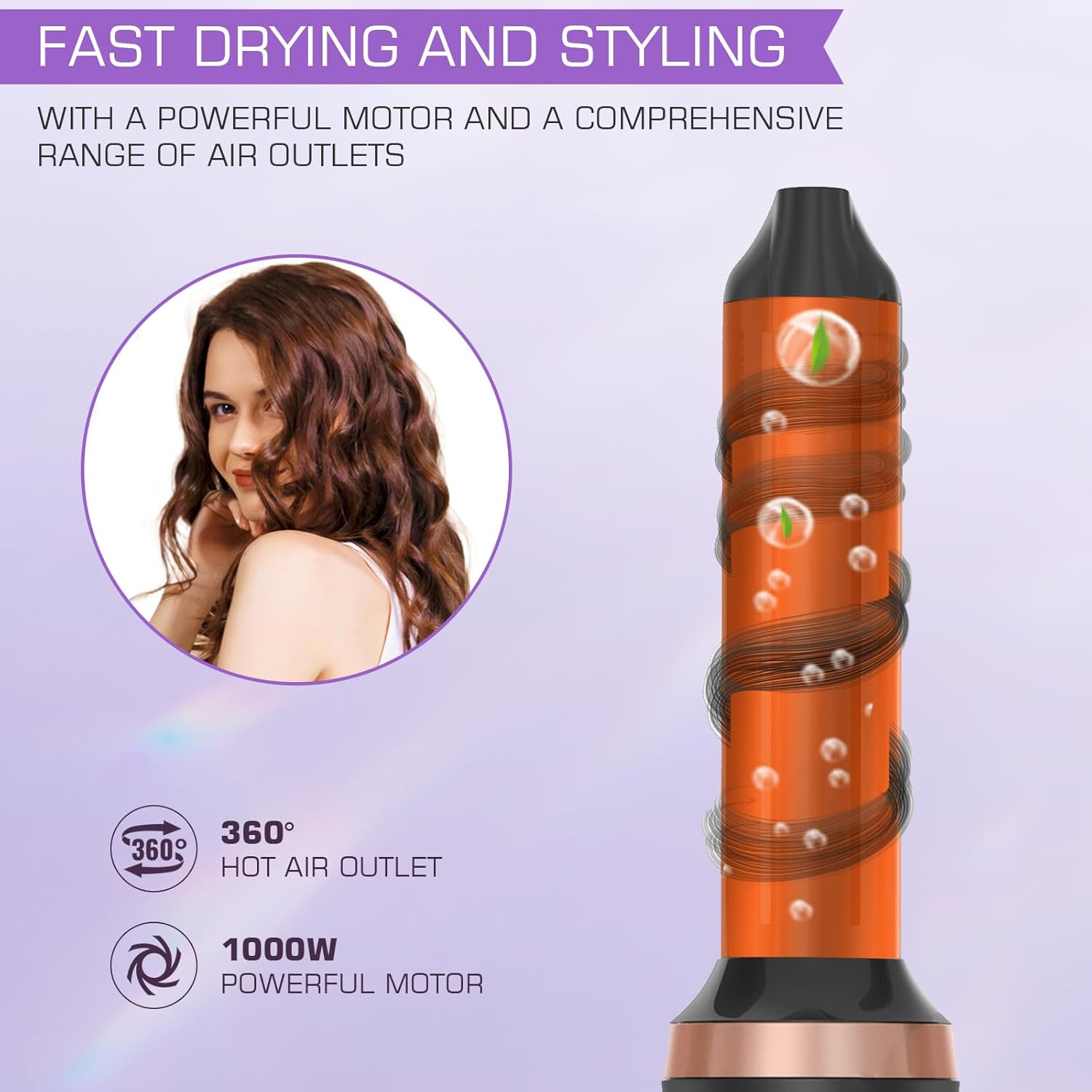 Air Styler All-in-One: de ronde borstel-haardroger produceert volumineuze, gladde, natuurlijk uitziende krullen zonder overmatige hitte, 2 x 32 mm cilinder voor losse en stevige krullen, wordt geleverd met 6 verwisselbare borstelopzetstukken die het föhnen en gladmaken vergemakkelijken. Het is een fluitje van een cent om je hoofdhuid te krullen, volume te geven en te masseren