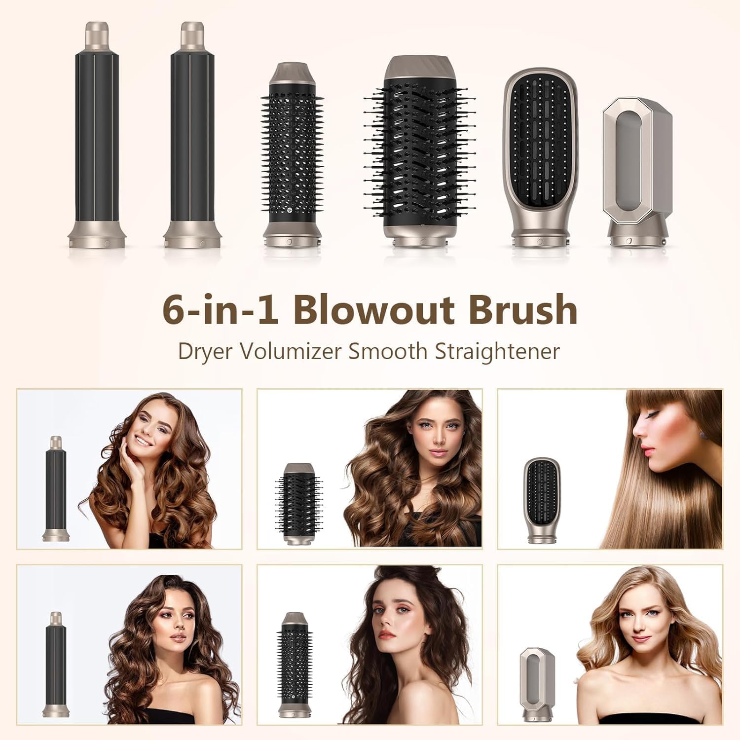 6-in-1 haardroger styling-gereedschap: deze 6-in-1 haarstyling-gereedschapsset bevat 1 x haardroger, 1 x heteluchtborstel, 2 x luchtkrultangen, 1 x volumegever, 1 x massage-stijlborstel, afneembare vervangende haardroger. Draag verbrandingsbestendige handschoenen om brandwonden te voorkomen (je kunt in de eerste minuten na het eerste gebruik een lichte geur waarnemen, dit is normaal en verdwijnt snel)