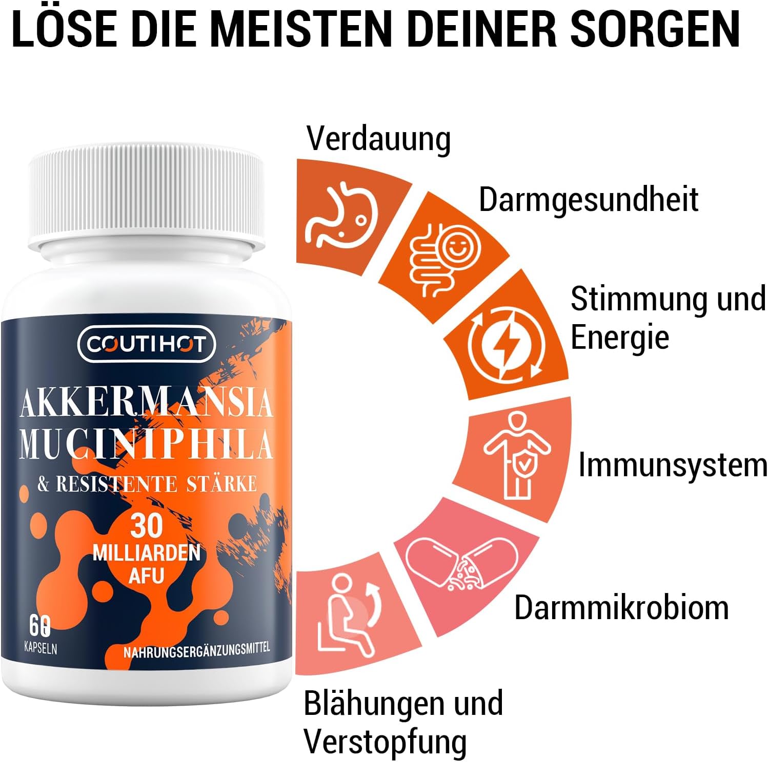 30 Miljard AFU Akkermansia – Akkermansia Muciniphila, ook bekend als de ‘slijmliefhebber’, heeft het vermogen om te gedijen op de slijmlaag van het maagdarmkanaal. Studies tonen aan dat de Akkermansia-stam ongeveer 4% uitmaakt van de darmbacteriën bij mensen. De Akkermansia-capsule van Coutihot levert 30 miljard AFU’s (actieve fermentatie-eenheden) per portie.