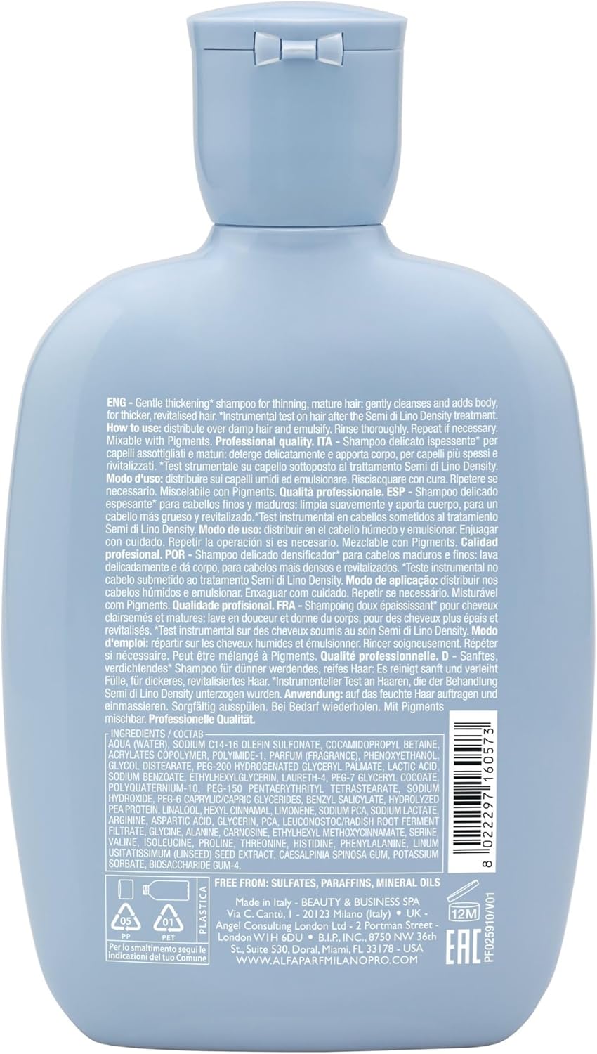 Alfaparf Milano Semi Di Lino Density Thickening Low Shampoo 250ml – shampoo ispessente Shampoo delicato ispessente per capelli assottigliati e maturi.Ispessisce, rimpolpa, rivitalizzaSemi di Lino Thickening Low Shampoo deterge delicatamente e apporta corpo alla fibra capillare, donando ai capelli assottigliati spessore e vitalità.