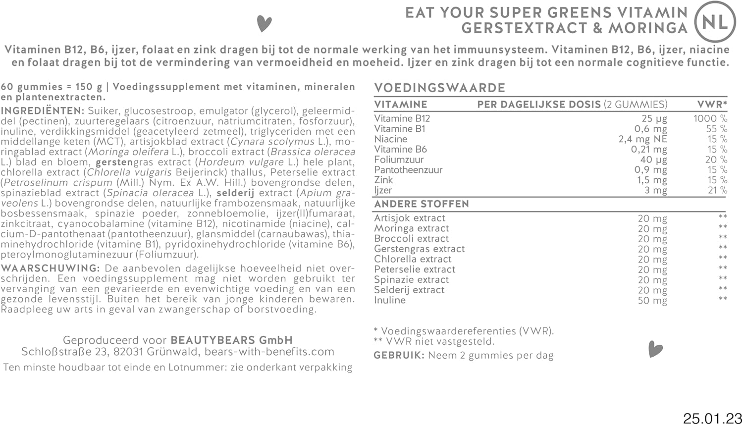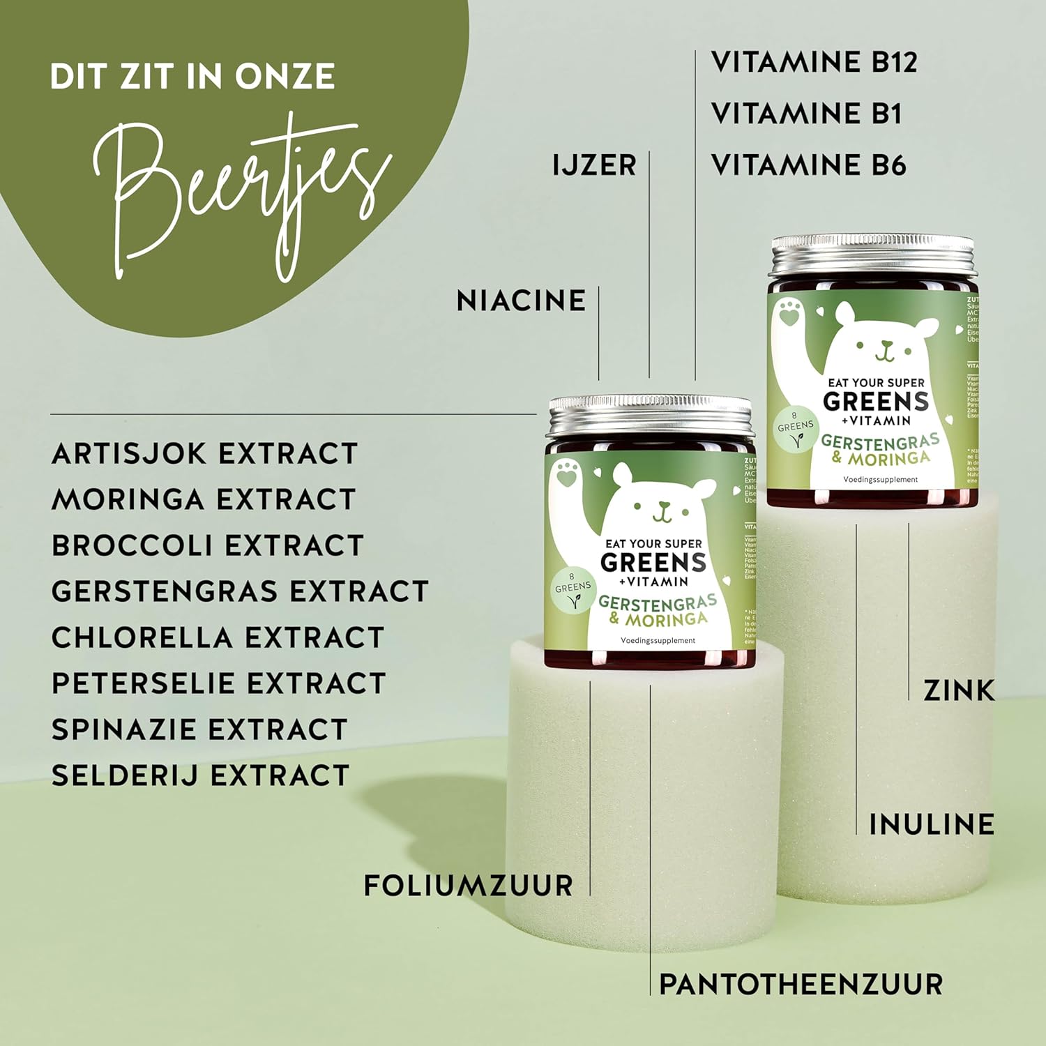 Eet je groenten! Onze hooggedoseerde vitaminegummies bevatten 8 populaire groene supervoedingsmiddelen en zijn aangevuld met een hooggedoseerd vitamine- en mineralencomplex. Gerstegras is rijk aan B-vitamines, calcium, magnesium en ijzer. Morginga wordt beschouwd als een van de meest voedingsrijke planten ter wereld. Aloë Vera ondersteunt de normale werking van het immuunsysteem. De microalg Chlorella heeft een ontgiftende werking en ondersteunt de aanmaak van rode bloedcellen. Onze gummies bevatten ook artisjok, broccoli, peterselie, spinazie en selderij. Om de werking van onze gummies compleet te maken, zijn vitamine B12, B6, ijzer, foliumzuur, niacine en zink aan het formularium toegevoegd ter ondersteuning van een normale werking van het immuunsysteem.