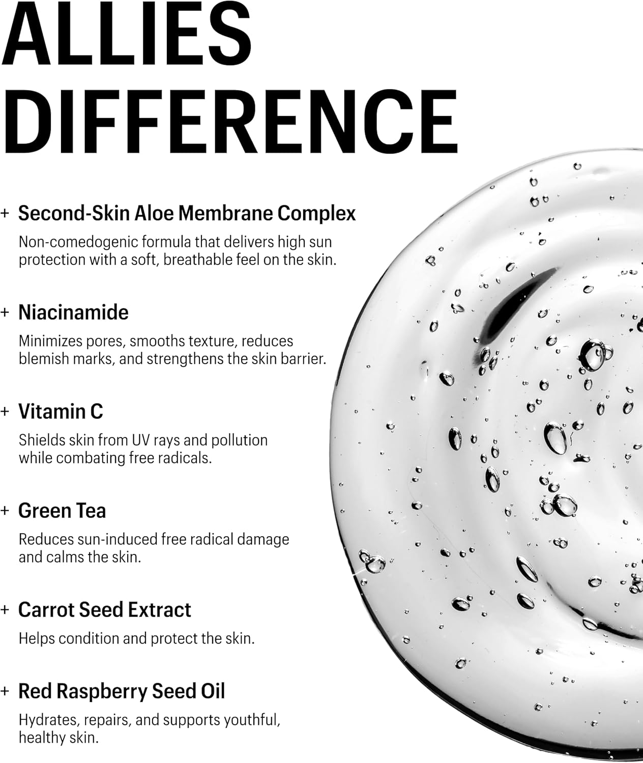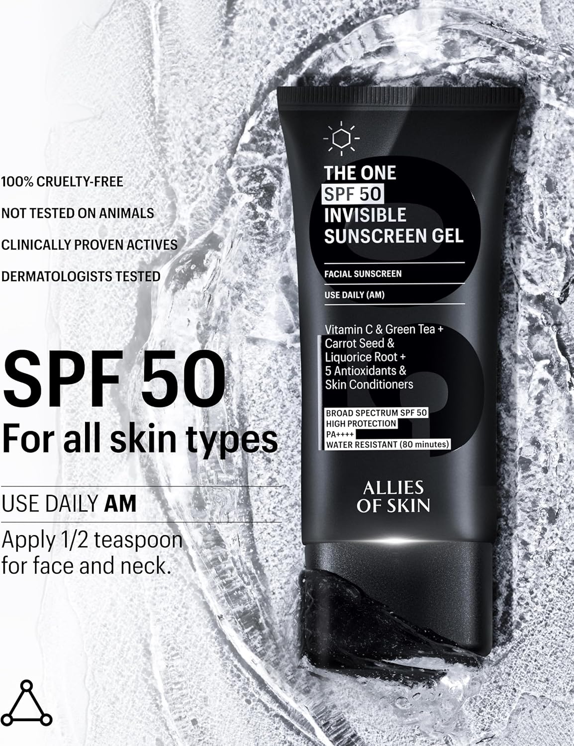Allies of Skin – The One SPF 50 Invisible Sunscreen Gel with Vitamin C, Green Tea, Carrot Seed, Red Raspberry Seed Oil & Licorice Root, and 5 Antioxidants & Skin Conditioners. 50 ml/ 1.7 oz
