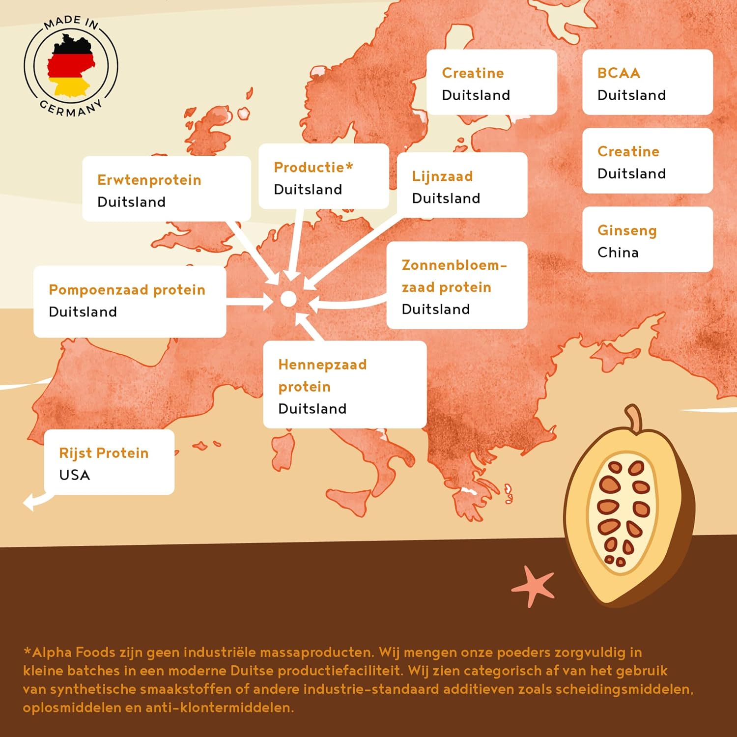 🍃 Volledig plantaardig: Alpha Foods zijn niet alleen veganistisch, maar ook volledig plantaardig. We vermijden niet alleen dierlijke producten, maar gebruiken ook nooit kunstmatige en antibiogene additieven zoals zoetstoffen (waaronder sucralose, acesulfame-K en aspartaam), smaakstoffen, synthetische gietmiddelen, losmiddelen, vulstoffen of bindmiddelen. Alle Alpha Foods zijn de beste complete voedingsmiddelen en altijd lactose-, gluten- en GGO-vrij.