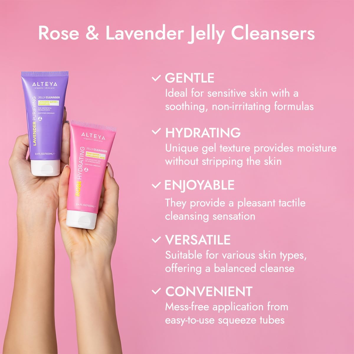 Experience the ultimate skincare routine with our 100% NATRUE Certified Organic Rose Jelly Cleanser, enriched with ORGANIC ROSE WATER and HYALURONIC ACID, that hydrates, cleanses, and reduces everyday buildup, without stripping skin of essential moisture.