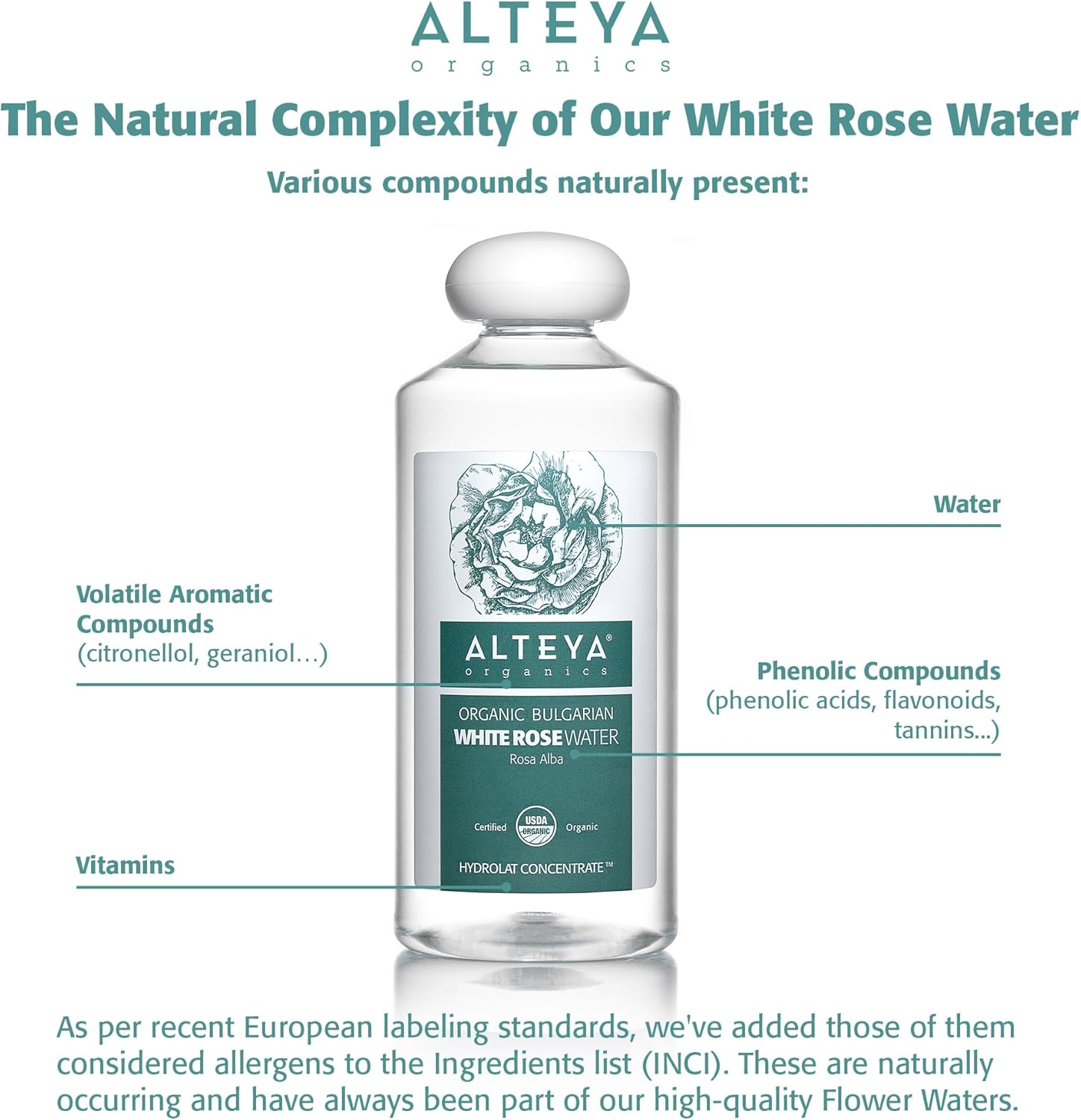 VAN ALTEYA’S ROZEN EN ALTEYA’s DISTILLEERDERIJ: Slechts één ingrediënt, 100% Pure Stoom-Gedistilleerd Gecertificeerd Biologisch “Alteya” Rosa Alba Skin-grade Destillaat. Rechtstreeks uit het hart van de Bulgaarse Rozenvallei. Het witte rozenwater van Alteya heeft niet het sterke kunstmatige aroma van rozenparfums of van de andere rozensoorten gedomesticeerde rozen die in bloemistenwinkels worden verkocht (het zijn verschillende rozensoorten zonder huidverzorgingseigenschappen). Het is geen water vermengd met etherische oliën of gemaakt in een laboratorium.