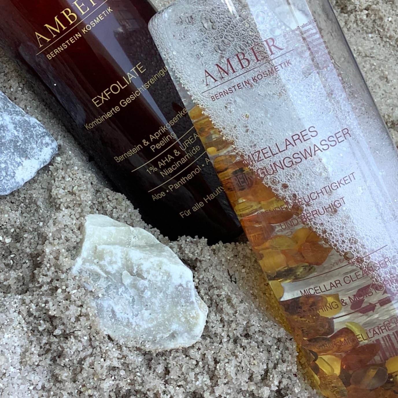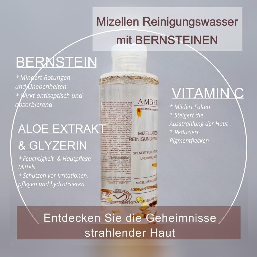 Amber micellair reinigingswater met echte barnstenen, 200 ml; gepatenteerde cellulaire activerende formule met barnsteen, aloë, panthenol en arganolie voor een zachte reiniging en zachte make-up