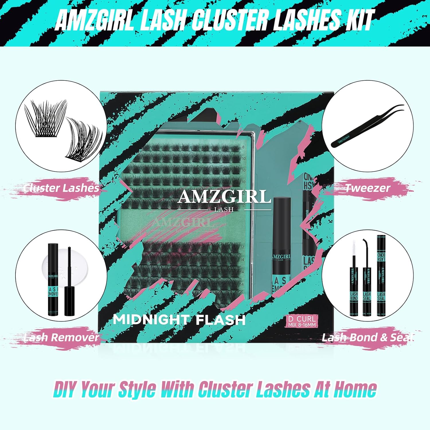 AMZGIRL LASH Midnight Doe-het-zelf wimperverlengingsset, 144 stuks, wimperlijm en afdichting, wimperlijmverwijderaar en applicator voor individuele valse wimpers, cluster (D-mix 8-16 mm kit)