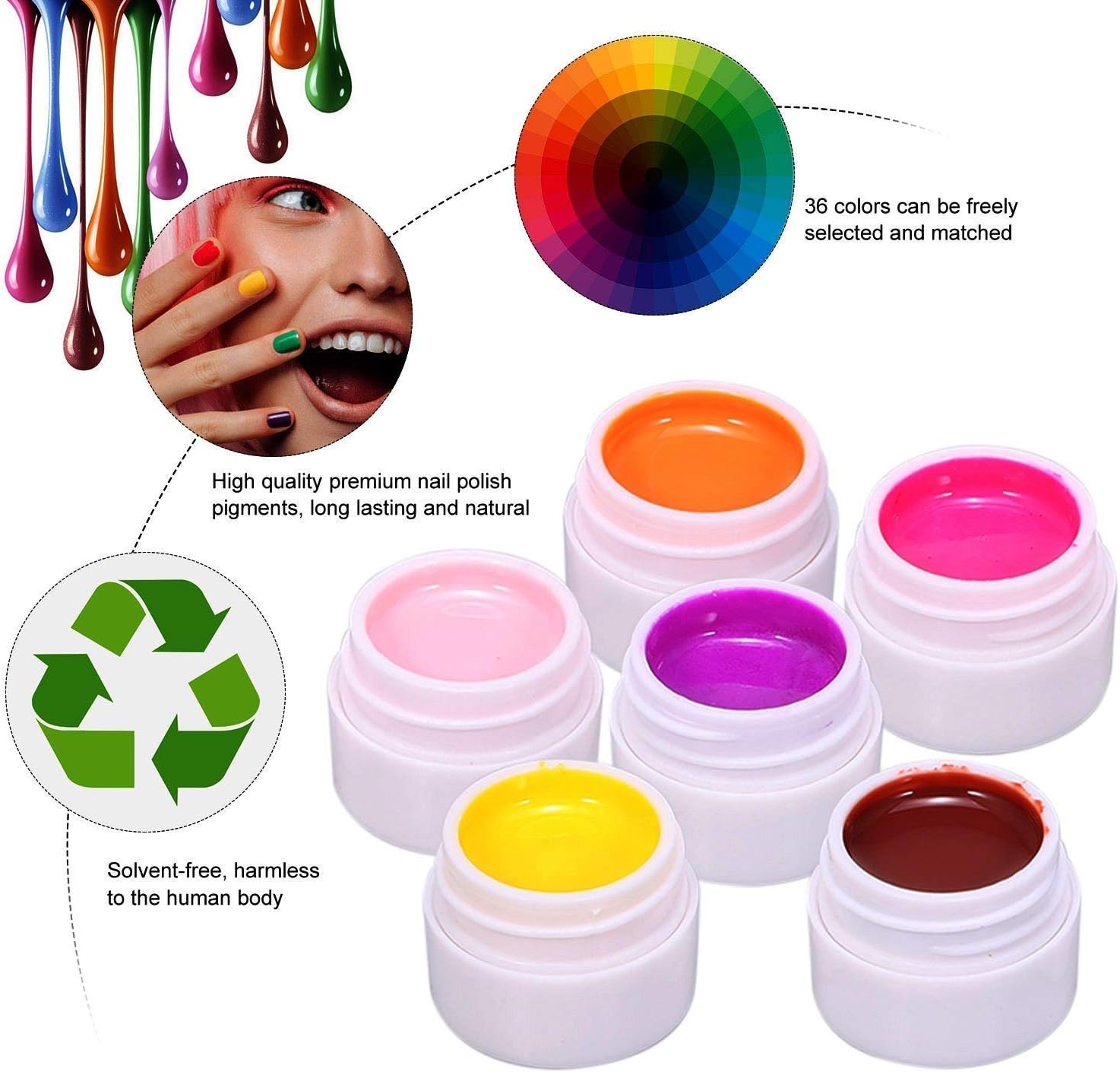 36 x 8 ml kleuren uv-kleurgel: de gelnagellakset bevat 36 verschillende uv-kleurgels. Bevat alle kleuren die je nodig hebt, is oplosmiddelvrij, onschadelijk voor het menselijk lichaam, veilig te gebruiken en gemakkelijk te schilderen. Gebruik voor het beste resultaat een uv-lamp om de kleurgel te drogen.