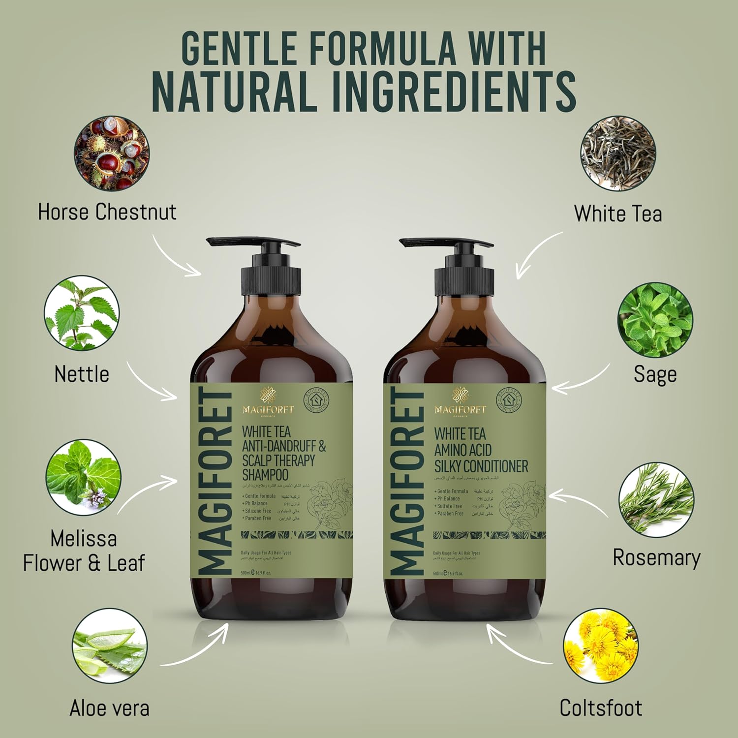 Ich hatte schon seit langer Zeit mit Schuppen, juckender und trockener Kopfhaut zu kämpfen, aber seitdem ich das MagiForet Shampoo und Conditioner Set benutze, sind diese Probleme Geschichte. Das Set kommt in praktischen 500-ml-Flaschen mit Pumpfunktion, was die Dosierung einfach und sparsam macht.Anwendung und WirkungDie Anwendung des Sets ist kinderleicht: Auf das nasse Haar auftragen, sanft einmassieren und gründlich ausspülen. Bei Bedarf kann der Vorgang wiederholt werden. Bereits nach den ersten Anwendungen habe ich eine deutliche Verbesserung bemerkt. Meine Kopfhaut fühlt sich gepflegt und ausgeglichen an, der Juckreiz hat sich spürbar reduziert, und die Schuppenbildung hat stark nachgelassen.Shampoo – Reinigung und FrischeDas Shampoo hat eine angenehm frische Duftnote, die den Haaren einen dezenten, sauberen Geruch verleiht, der den ganzen Tag anhält. Es reinigt sanft, entfernt Schuppenbeläge, reguliert die Talgproduktion und sorgt für eine tiefgehende Reinigung der Kopfhaut. Besonders hervorzuheben ist die sanfte Formel mit natürlichen Inhaltsstoffen wie Weißtee und Kräuterextrakten, die die Mikrozirkulation fördern und die Kopfhaut elastischer machen. Das Shampoo schäumt gut, lässt sich leicht auswaschen und hinterlässt ein erfrischtes, sauberes Gefühl.Conditioner – Feuchtigkeit und PflegeDer Conditioner enthält essenzielle Aminosäuren, die das Haar von innen stärken, die Haardichte verbessern und für sichtbar mehr Volumen sorgen. Er pflegt die Kopfhaut intensiv, stellt das Wasser-Öl-Gleichgewicht wieder her und macht die Haare weich und geschmeidig. Die Textur des Conditioners ist seidig und leicht, wodurch er sich gut im Haar verteilen lässt und für eine einfache, gründliche Ausspülung sorgt.FazitDas MagiForet Weißtee Shampoo und Conditioner Set hat meine Erwartungen übertroffen. Meine Kopfhaut fühlt sich beruhigt und gesund an, mein Haar ist kräftig, glänzend und voluminös. Besonders für Menschen mit Schuppenproblemen, juckender oder trockener Kopfhaut ist dieses Set ein echter Gamechanger. Die sanfte Reinigung und Pflegeformel machen es für alle Haartypen geeignet.