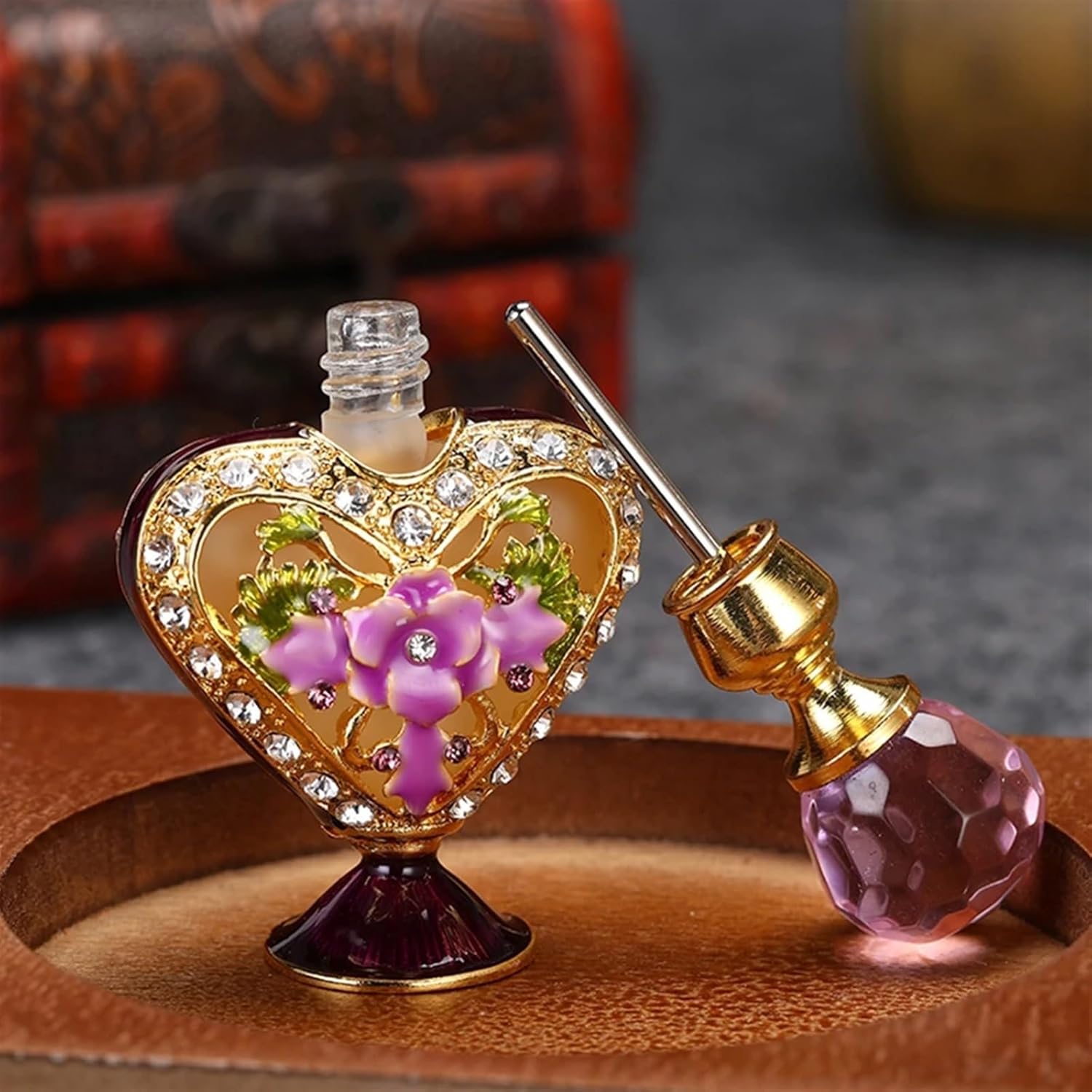 Antieke parfumfles, leeg 5 ml vintage roze paars glas gesneden bloem diamant decor kristallen dop navulling etherische olie handgemaakt cadeau