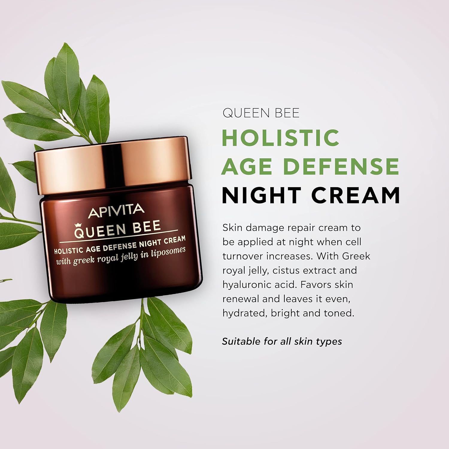 APIVITA Queen Bee Holistic Age Defense Night Cream 1.69 fl.oz. |Intensive Night Treatment That Speeds Skin Regeneration, Smooths Wrinkle & Increases Skin Elasticity with Royal Jelly & Hyaluronic Acid$95 is super steep for night cream. I’m very familiar with royal jelly as I used a face cream with it 2 decades ago. At that time the 1.5 oz product was $150.I have very DRY & MATURE skin and found this night cream to glide easily over my face with a rich, thick, moisturizing feel. My skin loves it.Royal jelly is a secretion from the glands of worker bees that is used to nourish larvae.I’m not a scientist, nor a doctor, so I turned to google as my modern day encyclopedia.“The composition of royal jelly makes it a multitasking ingredient in skin care. It can fight signs of aging with the powerful vitamins B, C, and E, amino and fatty acids, minerals, and antioxidants which soothe and nourish skin. It is a popular ingredient in skin creams, and research supports its use as a COLLAGEN ENHANCER. By boosting collagen production in the skin, royal jelly also helps to protect skin against the effects of ultraviolet radiation.”The product page doesn’t have the ingredients listed. I wish Amazon would require it. Regardless, I included a photo of the ingredients from the box and I also included them below this review.If this fits in your budget, I highly recommend.🤗 Thank you so much for taking the time to read this review, have a FANTASTIC day!!😊Ingredients (as listed on box, see photo for reference):Aqua/Water/Eau**, Aqua/Water/Eau, Glycerin, Hydrogenated Vegetable Oil, Cetearyl Alcohol, Butyrospermum Parkii (Shea) Butter*, Theobroma Cacao (Cocoa) Seed Butter, Propanediol, Dodecane, Glyceryl Stearate, Coco-Caprylate/Caprate, PEG-100 Stearate, Mel Extract/Honey Extract/Extrait de miel*, Royal Jelly, Cera Alba/Beeswax/Cire d’abeille*, Propolis Extract, Rosa Canina Fruit* Extract, Zizyphus Jujuba Seed Extract, Cistus Incanus Flower/Leaf/Stem Extract, Commiphora Myrrha Oil, Olea Europaea (Olive) Fruit Oil*, Rosa Damascena Flower Oil*, Boswellia Carterii Oil*, Oryza Sativa (Rice) Bran Oil, Panthenol, Sodium Hyaluronate, Papain, Algin, Tocopherol, Sigesbeckia Orientalis Extract, Rabdosia Rubescens Extract, Gynostemma Pentaphyllum Leaf/Stem Extract, Hellanthus Annuus (Sunflower) Seed Oil*, Glyceryl Linoleate, Glyceryl Linolenate, 1,2-Hexanediol, Bisabolol, Lecithin, Hydroxypropyl Cyclodextrin, Arginine, Disodium EDTA, Ethylhexylglycerin, Glutamine, Ascorbyl Tetraisopalmitate, Acrylates/C10-30 Alkyl Acrylate Crosspolymer, PEG-20 Stearate, Sorbitan Stearate, Citric Acid, Decyl Glucoside, Phytoecdysteroids, Carbomer, Caprylyl Glycol, Butylene Glycol, Phenethyl Alcohol, Phenoxyethanol, Parfum/Fragrance, Benzyl Salicylate, Linalool, Limonene, Citronellol, Geraniol, Alpha-Isomethyl Ionone, Hydroxycitronellal,*Organic Cultivation/ issu de l’agriculture biologique**Rosa Canina Fruit* Aqueous Infusion=Wild Rose Infusion/ Infusion de rose sauvage