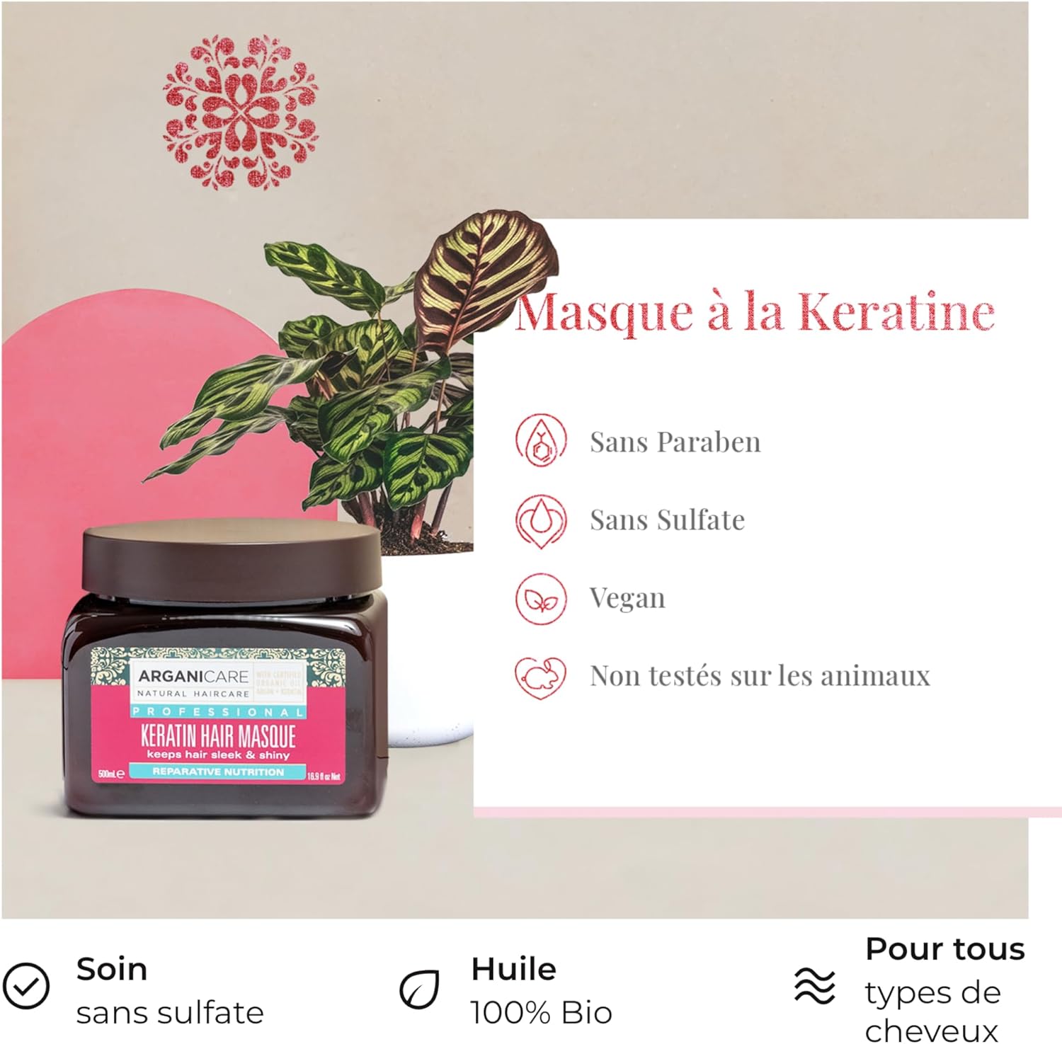 Gerichte formule: dit Arganicare haarmasker is een voedzaam masker op basis van keratine, arganolie, panthenol (vitamine B5) en vitamine E, interessante werkzame stoffen voor het haar en de verzorging van Braziliaanse stijltangen.