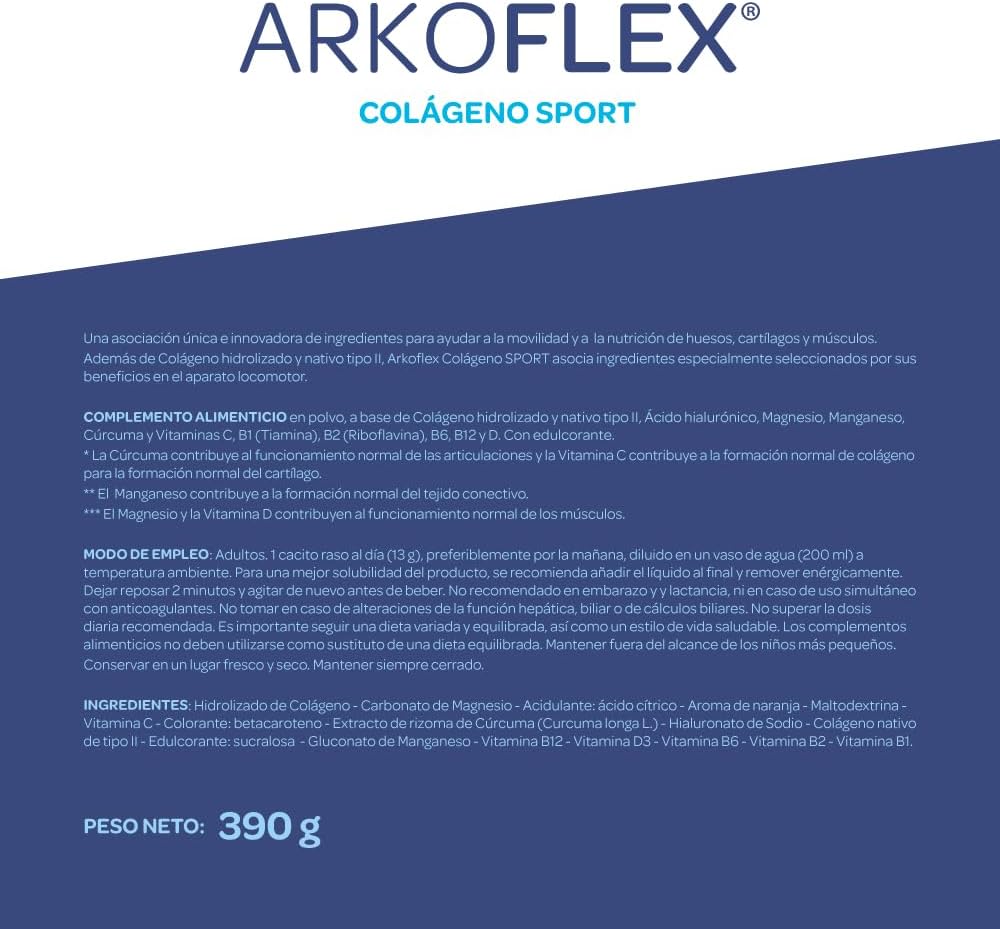 Arkopharma Arkoflex Sportcollageen, gehydrolyseerd collageen, sinaasappelsmaak, doos met 390 g, gewrichten, botten en spieren, hyaluronzuur, magnesium, mangaan, kurkuma en vitamines