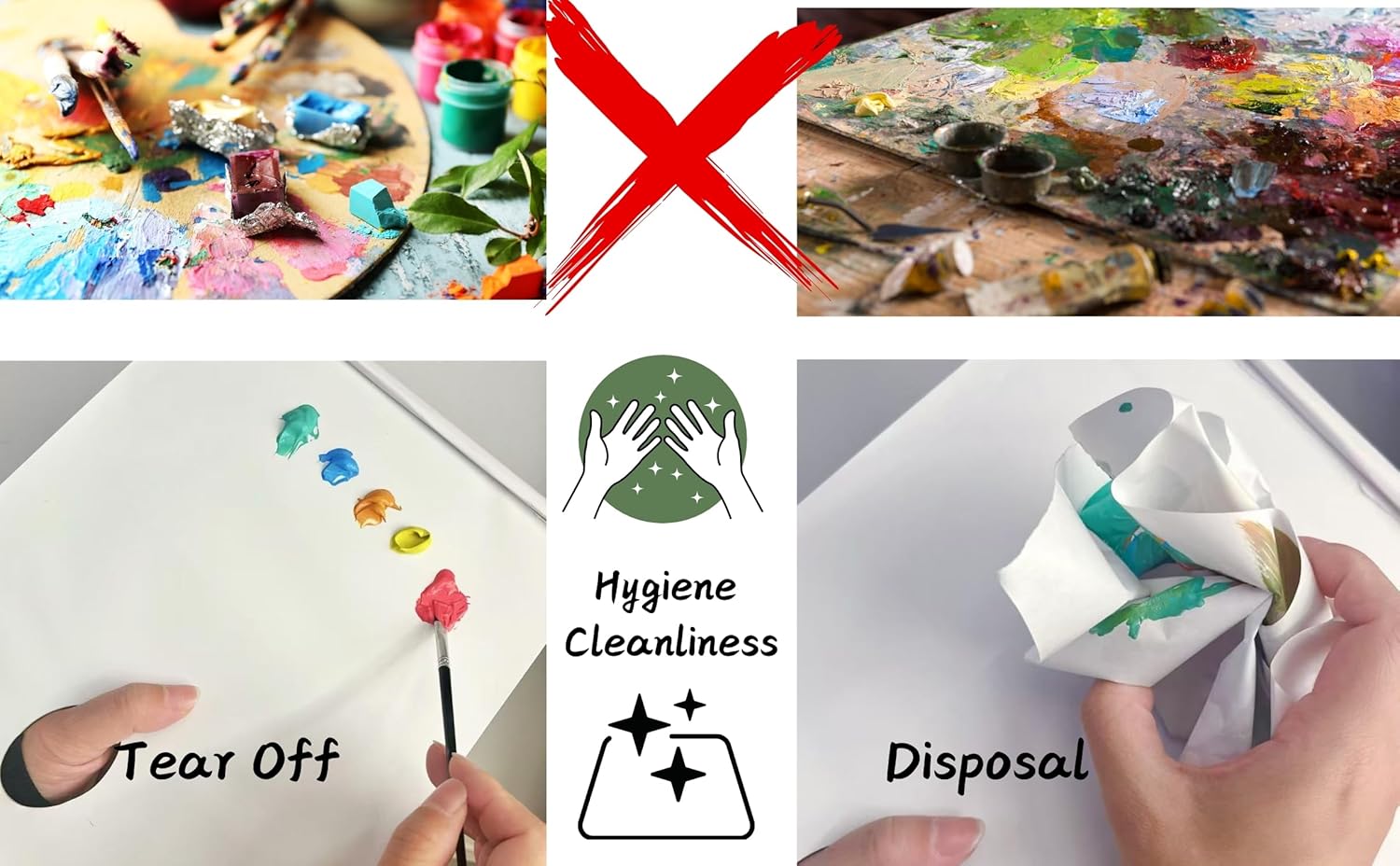 Eenvoudig afscheuren: de palletvellen zijn zeer eenvoudig te gebruiken, ze verbinden zich veilig met elkaar, meng gewoon je kleur op het eerste verse vel zodra je je kunstwerken hebt gedaan, trek je gewoon het vel eraf en gooi het weg. Geen wassen, geen rommel. Het volgende blad is klaar voor gebruik!