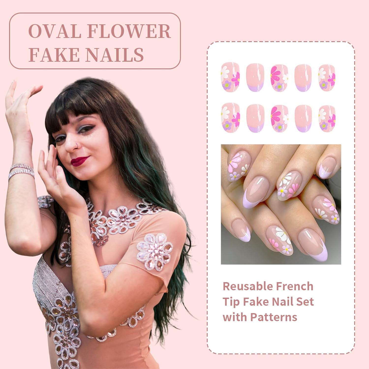 Auiremrti Press On Nails Set – 24 Pieces Artificial Nails – French Manicure False Nails with Floral Pattern – Includes Nail File, Hoof Sticks, Jelly Glue, Nail Glue