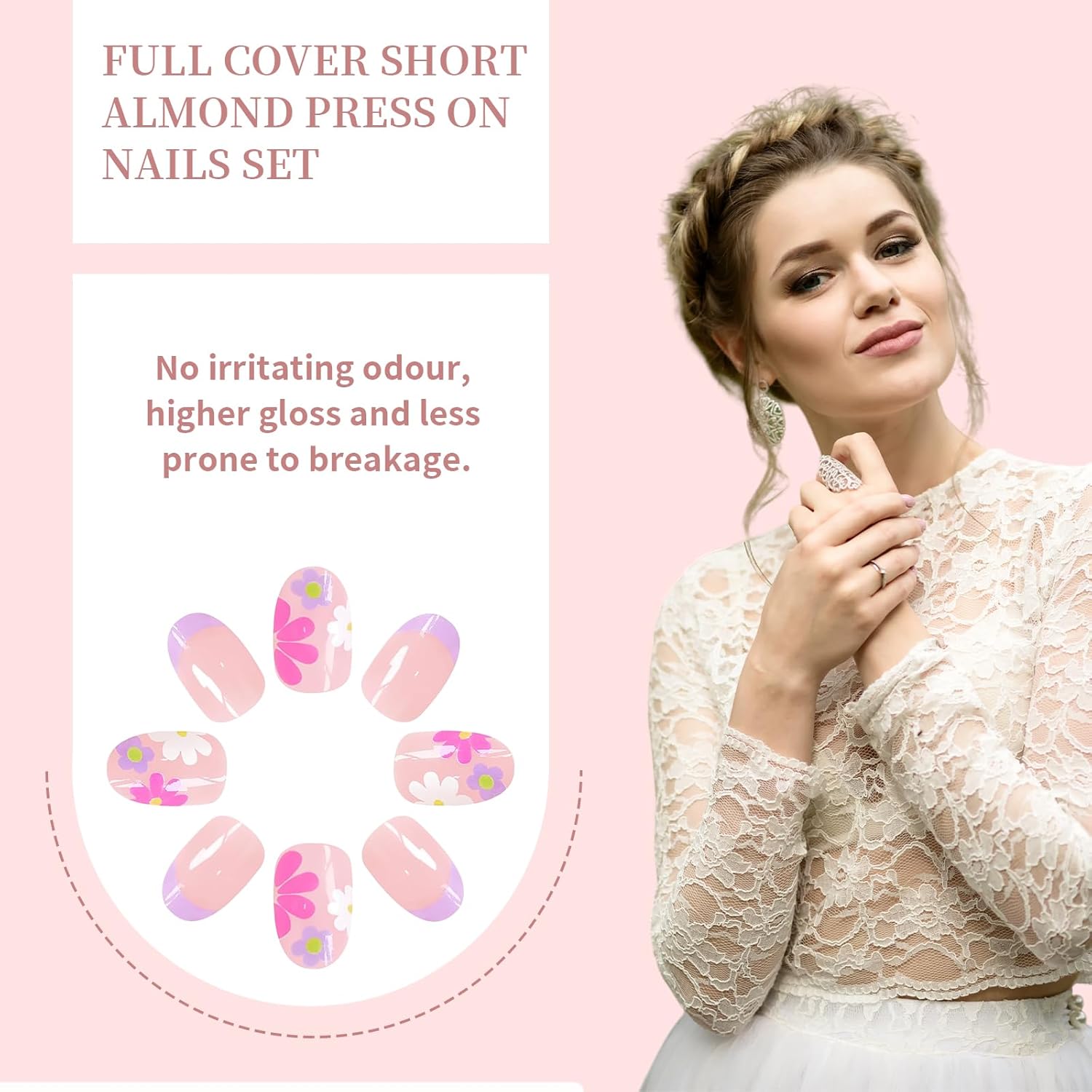 Easy to apply – This set contains 24 pieces of short French manicure nails with purple floral pattern, which are easy to use and do not require additional glue. Ideal for quick use at home, without visiting the nail salon. The nails adhere securely and provide a long-lasting, professional look.