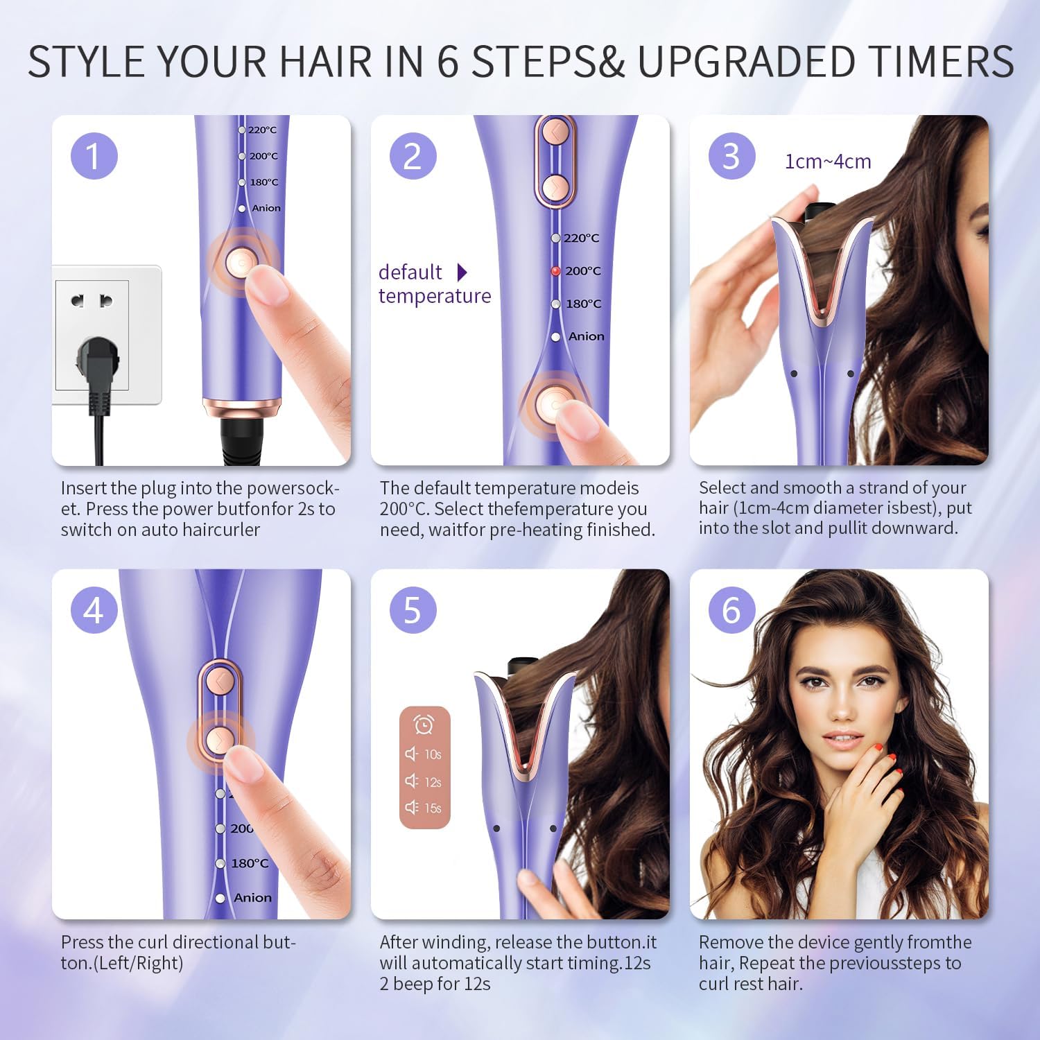 De professionele en elegante automatische krultang beschikt over een groot verwarmingsbereik en een timer. Je kunt voor het stylen van elk haartype verschillende timers en temperaturen gebruiken. Deze automatische krulspelden zijn geschikt voor korte, middellange en lange haartypes. Iedereen kan een expert worden op het gebied van krullend haar