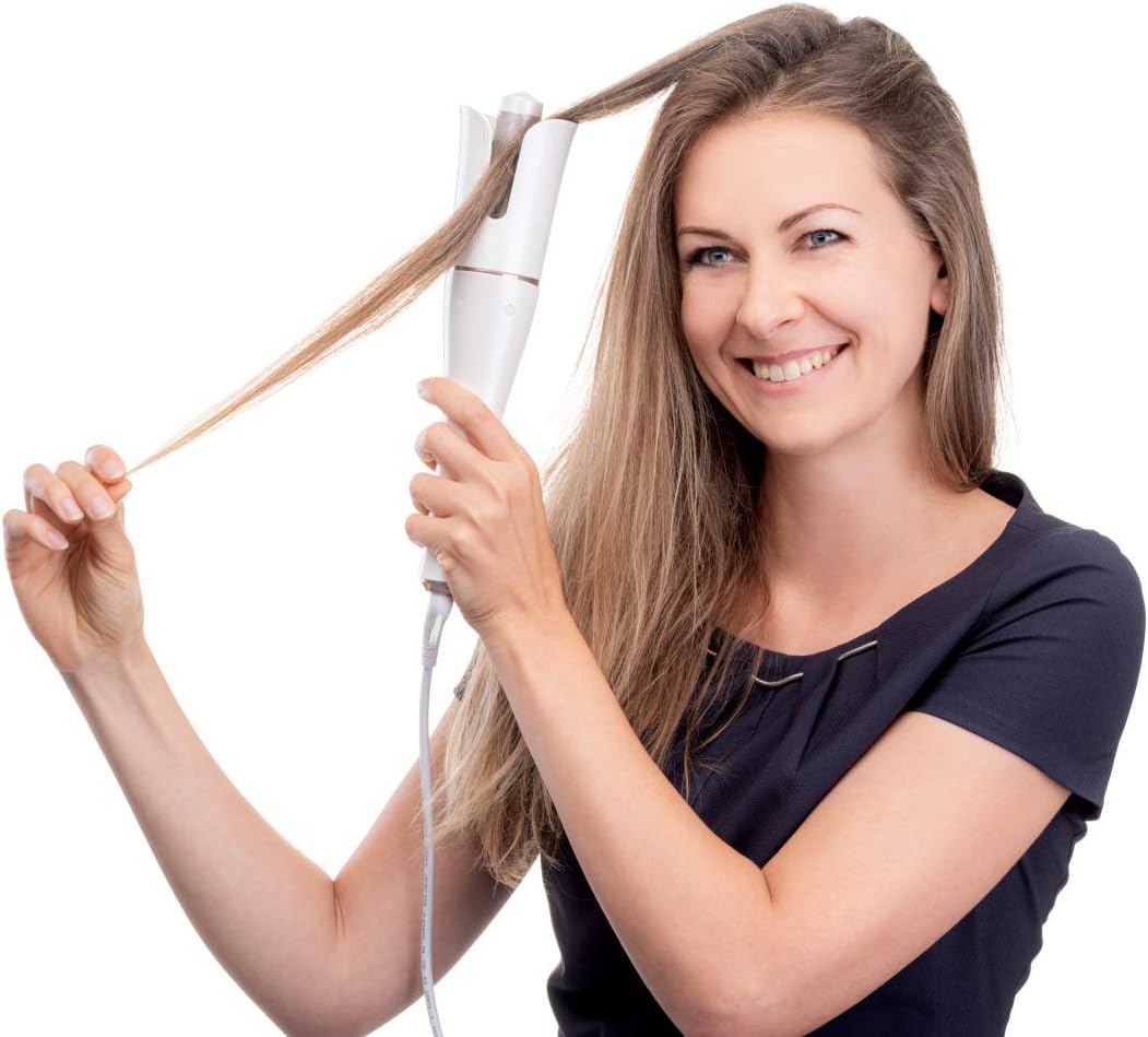 Een automatische krultang met keramische toermalijncoating met een diameter van 25 mm en ioneneigenschappen. Het gaat om een moderne en elegante krultang met het innovatieve rotatiesysteem en met PTC-radiator voor zeer snelle opwarming. Deze krultang zorgt voor verleidelijke kapsels, zoals grote wol en krullen.