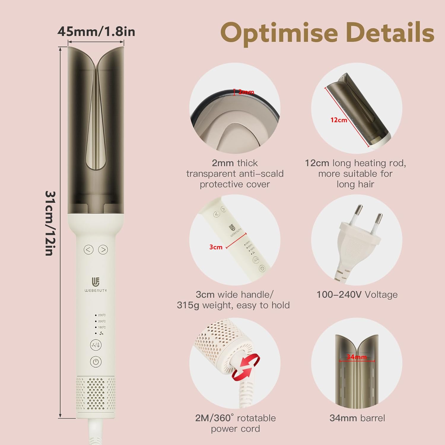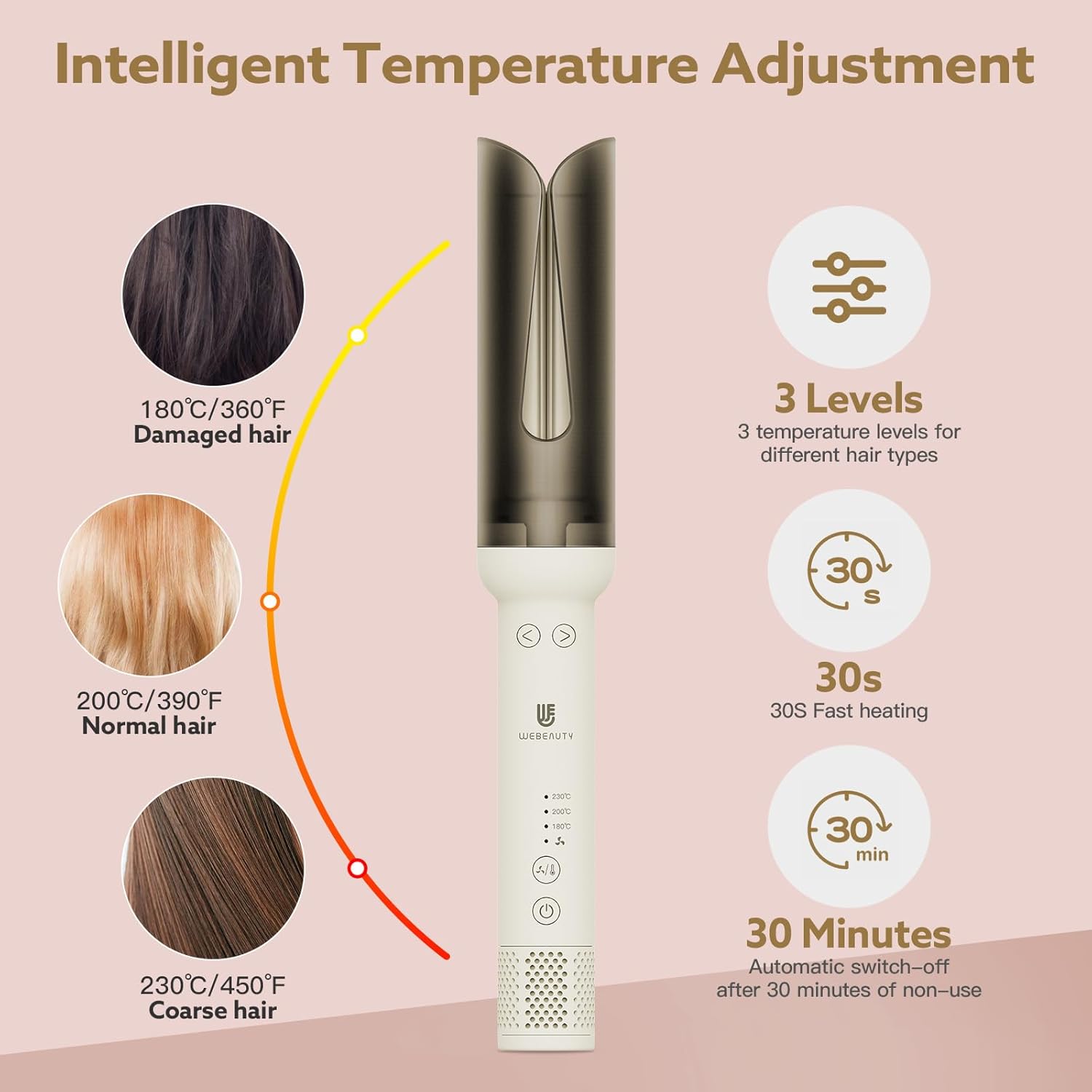 [Innovatief luchtsysteem] Na verhitting door het interne paneel wordt het haar automatisch gedraaid naar het externe 360° blaasgat dekkingsoppervlak, wat helpt om het haar af te koelen en krullen sneller vast te zetten door te blazen, waardoor natuurlijker en volumineuzer krullen worden gecreëerd terwijl warmteschade wordt verminderd. Het helpt ook de krultang om een constante temperatuur te behouden om oververhitting te voorkomen.
