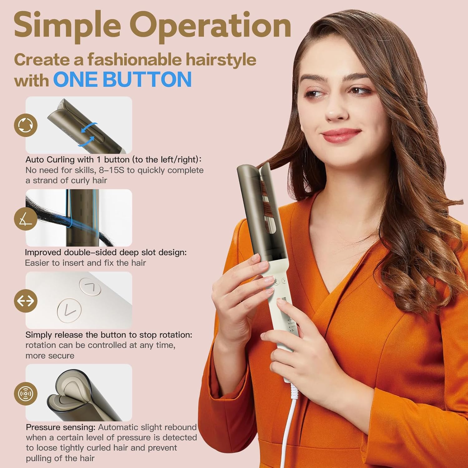 [Gemakkelijk krullen en klitvrij] Met slechts 1 knop kun je prachtige krullen maken in 8-15S zonder enige vaardigheid! En voor minder klitten worden de dubbele zijde diepe sleuf en drukdetectiefunctie toegevoegd: de sleuven kunnen zorgen voor gemakkelijker haarinbrengen en soepel haar draaien in het vaste bereik; met de drukdetectie zal er een micro-rebound zijn om het strak gekrulde haar los te maken, wanneer het detecteert dat al het haar goed gekruld is in de kamer, zodat het risico op klitten effectief kan worden verminderd.
