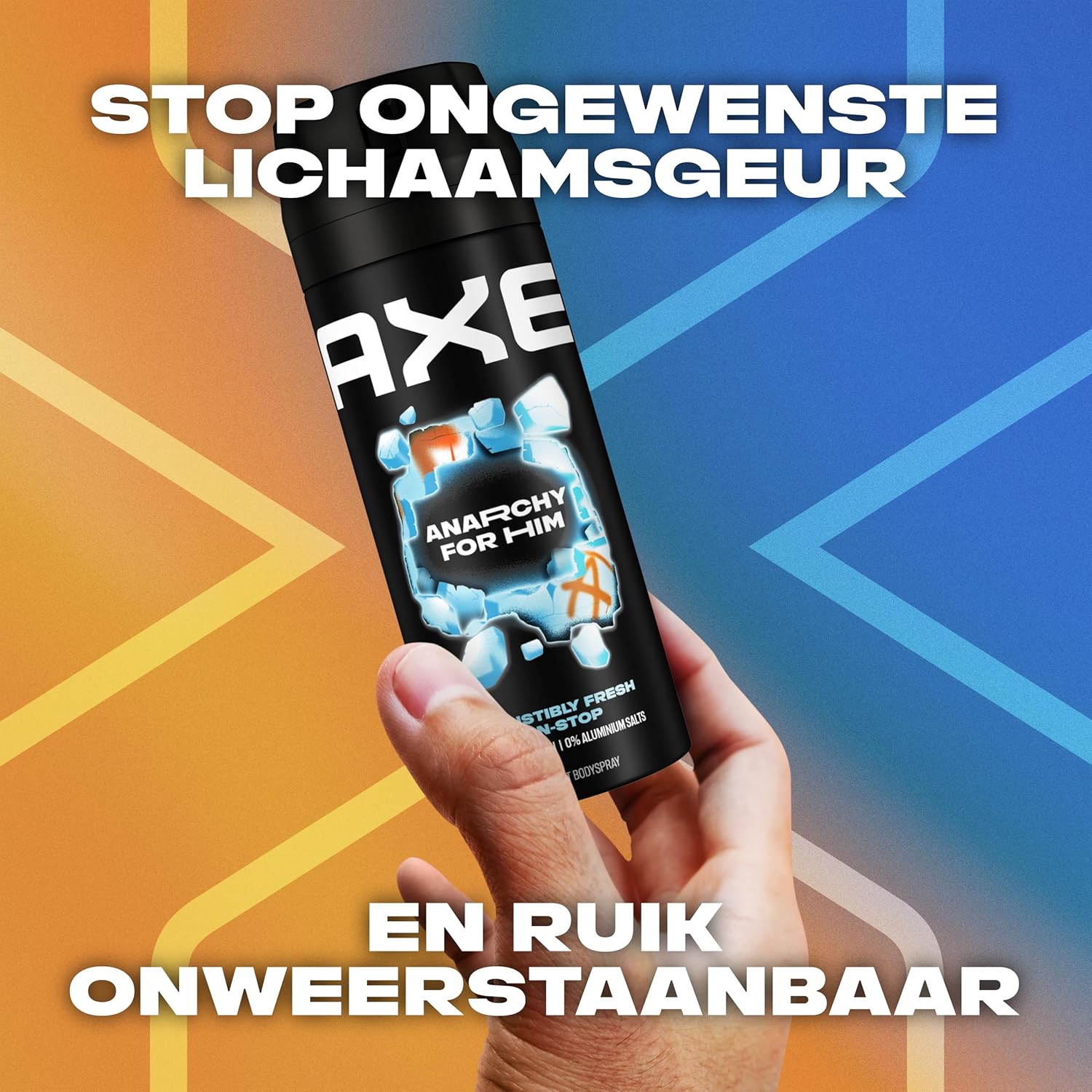 Breng fris blijven naar een hoger niveau. Leef dat dagelijkse frisse leven. Je weet nooit wat er kan gebeuren, dus heb je een deodorant bodyspray nodig die ervoor zorgt dat je de hele dag heerlijk ruikt, elke dag weer. Met zijn geurbeschermende technologie heeft de verbeterde Axe Anarchy For Him deodorant bodyspray het onder controle. De sensuele geur van granaatappel en sandelhout houdt je fris en 100% voorbereid. De hele dag door. Heb je onze frisse geüpgrade look gezien?Dat is niet het enige dat er verbeterd is. Onze revolutionaire technologie met dubbele werking bestrijdt de geur veroorzakende bacteriën, waardoor je dag en nacht onweerstaanbaar ruikt. Dus wat er ook op je pad komt, je bent er klaar voor. Maak je geen zorgen, we hebben niet geknoeid met de klassieke Axe Anarchy For Him geur. We weten dat die al perfect is. Bij Axe geloven we dat een van de sleutels tot aantrekkingskracht een onweerstaanbare geur is. Daarom zijn wij toegewijd om je de beste tools te geven om ervoor te zorgen dat, wanneer de gelegenheid zich voordoet, jij op je best ruikt. Van onze bodyspray tot onze douchegel, van onze anti-transpirant spray tot onze deodorant voor mannen, we doen er alles aan om ervoor te zorgen dat aantrekkingskracht voor iedereen is. Het vernieuwde en verbeterde Axe. Zorg goed voor jezelf en voor onze planeet.