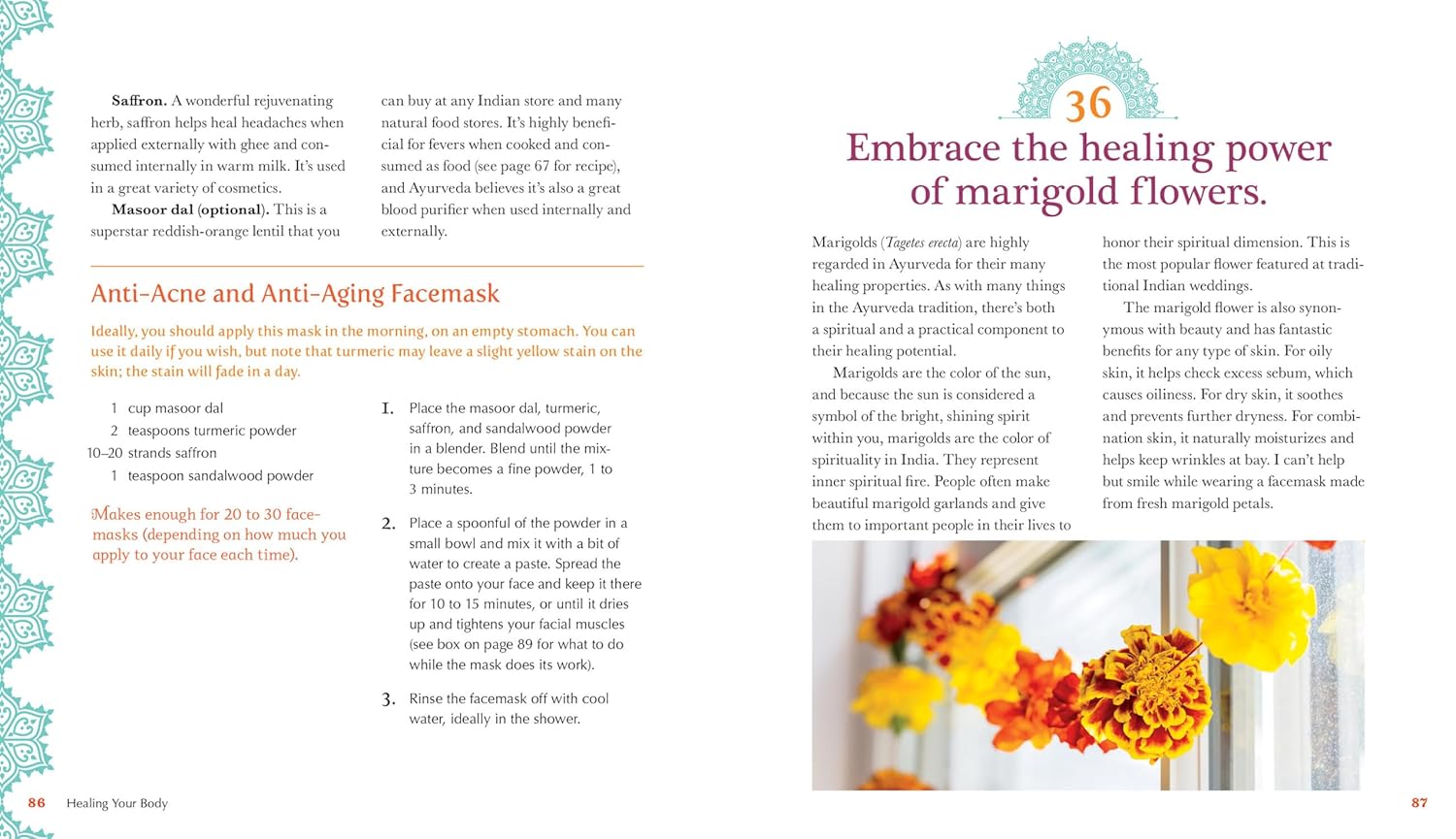Celebrated Ayurveda teacher Ananta Ripa Ajmera offers an inspiring introduction to this ancient Indian medical tradition, which complements and extends the health and wellness benefits of yoga. Through 108 short essays you will learn to approach optimal digestion, better sleep, less stress, and a more balanced life. Diet is key, and many essays are accompanied by recipes that incorporate into daily meals spices such as turmeric, cumin, ginger, and mustard seeds. In addition, meditation, yoga and breathing exercises, and self-care practices such as oil pulling and massage, make this time-tested wisdom available to contemporary holistic health enthusiasts — even beginners.