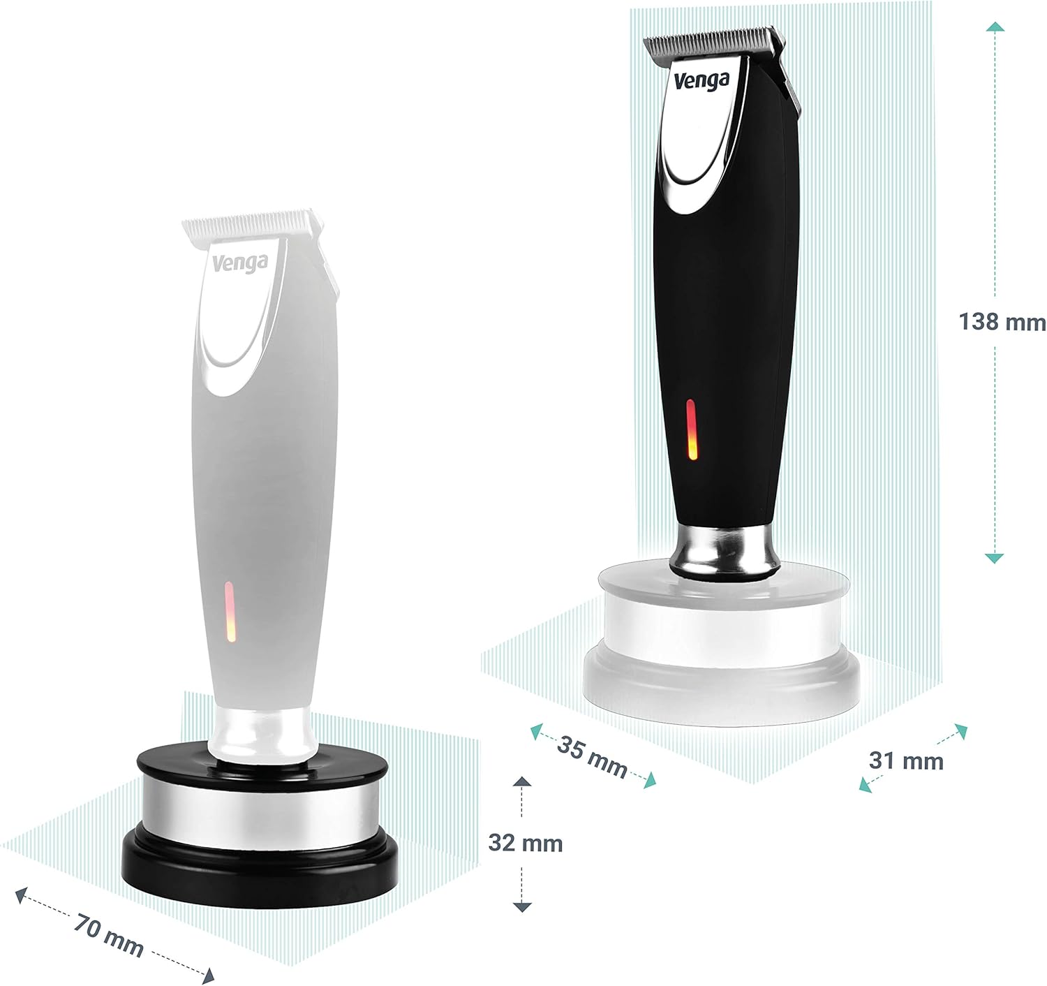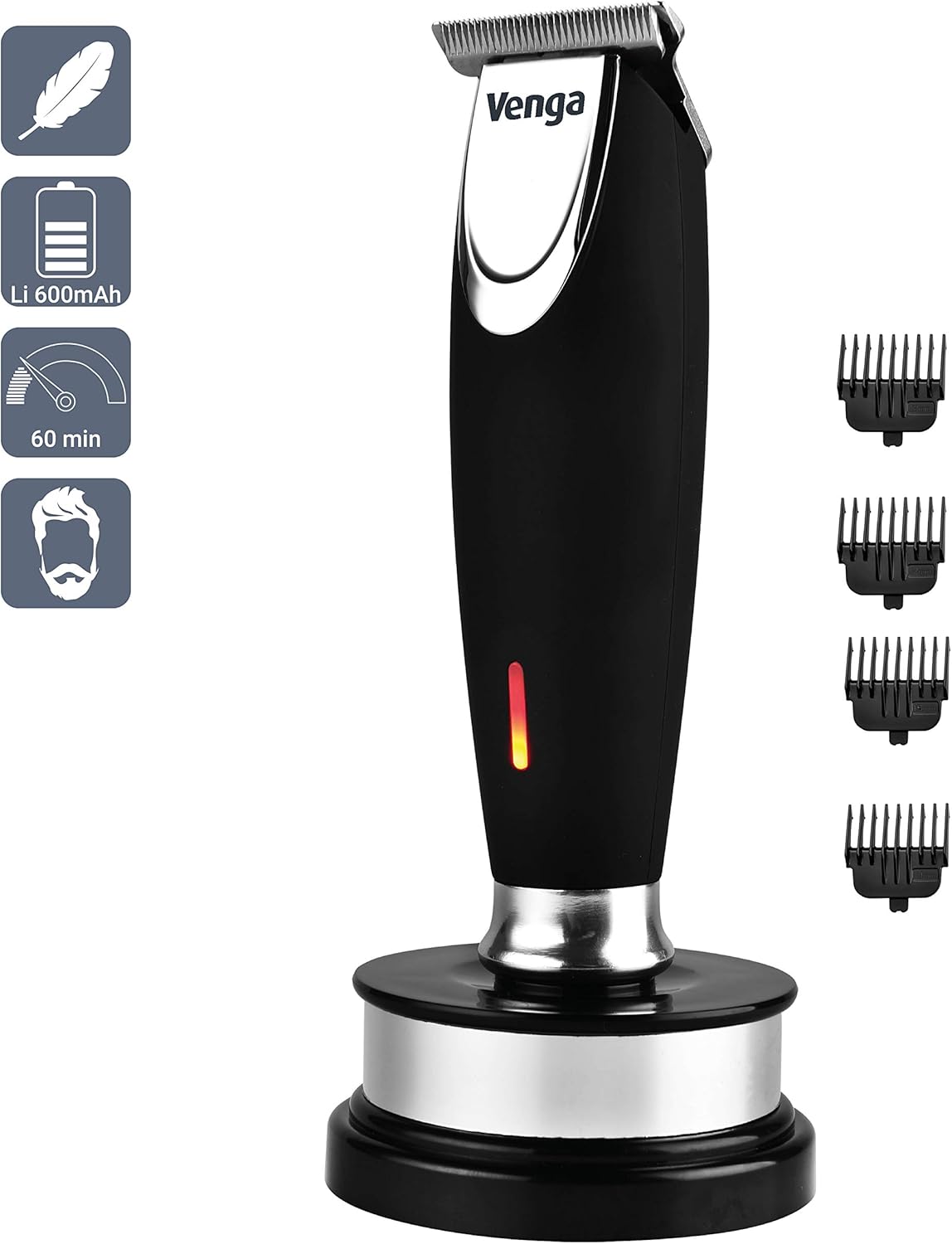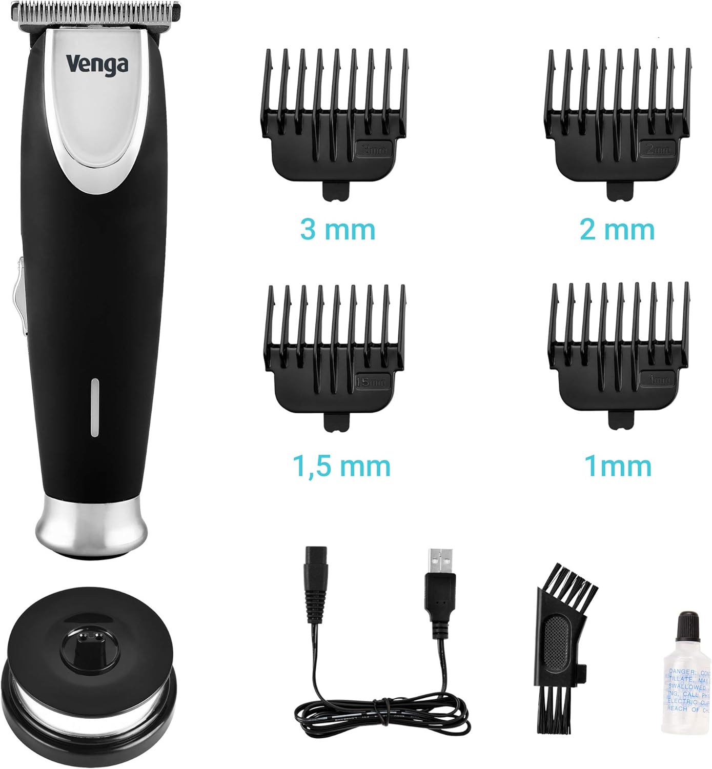 Il rasoio Venga è un prodotto multiuso, che consente di regolare barba e capelli, in modo perfetto e basico.E’ dotato di 4 pettini, inseriti all’interno del pacco, in modo da poter trattare sia la barba che i capelli.I pettini hanno le seguenti misure: 1 mm, c 1,5 mm, 2 mm e 3 mm.Le lame risultano essere ben affilate e realizzate in acciaio inox inossidabile.Il design delle lame è a T.E’ un prodotto wireless, privo di fili ma dotato di una batteria agli ioni di litio, da 600 mAh.Ha un’autonomia di circa 60 minuti, dopo una ricarica di 90 minuti. La base di ricarica ha un indicatore a led, che sta ad indicare la ricarica in atto.Nel set troviamo:-il rasoio-4 pettini-una spazzola-una boccetta di olio-un cavo di ricarica-una manuale d’utilizzo.Ha un bel design, pratico e comodo da utilizzare, in stile cromato e vintage, con un rivestimento sul manico, che rende soffice la presa ed anche particolarmente comoda. Basico ma molto funzionale.